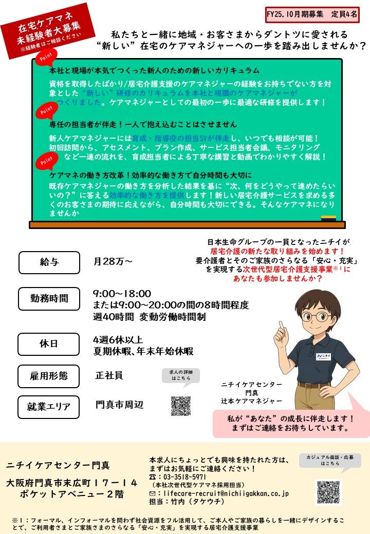 職場環境・雰囲気 | 【Point オススメポイント】 ☆アピールポイント☆ ◎経験豊富な先輩ケアマネジャーが育成専任者として伴走支援+入社時特別研修による手厚い育成体制 ・伴走支援期間は15ヶ月! ・在宅のケアマネジャーが初めてでも安心して働ける研修プログラム ◎効率よく無理のない働き方 ・ケアプラン41件以上保有する現役ケアマネジャーの業務運営をモデル化 ◎業界水準以上の給与制度・福利厚生等を含めた報酬制度 ☆皆さまへのメッセージ☆ 要介護者とそのご家族のさらなる「安心・充実」を実現する次世代型居宅介護支援事業にあなたも参加しませんか? 【Message 採用担当者より】 ニチイ学館ライフケアソリューションセンターでは、当社の雰囲気や業務内容をより深くご理解いただくために、 **カジュアル面談(オンライン形式)**も実施しています。 「まずは話を聞いてみたい」「実際の業務についてもっと詳しく知りたい」という方もまずはご応募ください。 (ご応募いただいた後に面接かカジュアル面談の選択が可能です。) 私たちと一緒に地域・お客さまからダントツに愛される “新しい”在宅のケアマネジャーへの一歩を踏み出しませんか? 皆様のご応募心よりお待ちしております! |