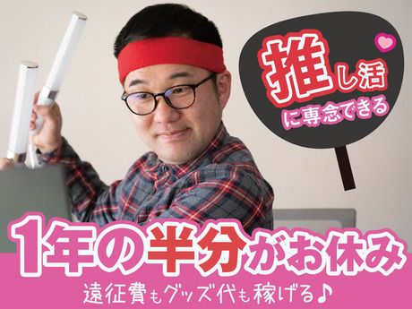 職種/仕事内容 | 仕事内容 【支えたいぞ、推し】 できる限りイベントに行きたい。 グッズも全部買いたい。 ギフト贈って支えたい。 …ダメだ。 今の仕事だと休みもお金も足りない。 どこかにないか。 推し活をサポートしてくれるような仕事。 自分の理想をかなえてくれる仕事。 なんだっていい。 推しのために働くんだ。 どこだっていい。 推しのために稼ぐんだ。 …あ、見つけた。 【待ってろ、推し】 1年の半分が休み? 未経験でも月収26万円以上可能? 寮に住む場合は寮費無料で完全個室? おいおいおい。 しかも未経験でも大歓迎って。 こりゃ応募しかないじゃん。 …と、これが去年の自分。 実際働いてみると、 条件は全部本当だった。 来週もイベントだ。グッズも出る。 全部買える。 推し活できる生活って、いいな。 【仕事内容】 半導体の前・後工程のお仕事。 クリーンルームでの装置オペレーション、運搬、検査業務! デジタルカメラやスマートフォン等に使用されている半導体の製造に関わるお仕事です。 簡単なキーボード操作などもあります。 【この仕事の魅力】 ・未経験大歓迎!教育体制が充実 ・お仕事を覚え、1人立ちするまでしっかりと教えます ・1R寮あり!通勤手当あり! ・残業管理は1分単位 ・退職金制度有! ・昇給制度有! ・設備関係のメンテナンス業務経験がある方も大歓迎!(資格取得制度も有) ・経験者はスキルに応じスタート時給UP ・スキルアップ制度あり! ・18~45歳の男性活躍中! 【作業環境とロードマップ】 【作業環境】 工場内はクリーンルームでとっても綺麗な職場環境! 未経験の方でもしっかり教育を行うので安心して仕事に取り組む事が出来ます。 【ロードマップ】 半導体製造業務~設備保守保全まで業務締結をおこなっている為 製造現場で「リーダー」「責任者」のポジションや 設備保守保全業務にて「手に職をつける」事もできます。 |