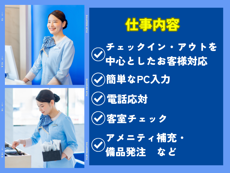職種/仕事内容 | 仕事内容 ■仕事内容 -簡単なPCでの入力作業 -各お部屋のチェック、備品発注 -自販機の補充やロビーの簡単な清掃、 -予約の受付や変更の電話対応 など ▶長く働き続けられる制度が充実  ̄ ̄ ̄ ̄ ̄ ̄ ̄ ̄ ̄ ̄ ̄ ̄ ̄ ̄ ̄ ̄ ̄ ̄ ̄ ̄ 産休・育休後の復職実績多数。 将来のライフイベントとも 無理なく両立できます。 ▶3年後のキャリアを見据えた制度あり  ̄ ̄ ̄ ̄ ̄ ̄ ̄ ̄ ̄ ̄ ̄ ̄ ̄ ̄ ̄ ̄ ̄ ̄ ̄ ̄ フロントスタッフとして3年以上経験を積むと、 支配人補佐,支配人,本社部門への キャリアアップ・ステップアップが目指せます。 実際に支配人補佐と支配人が フロントスタッフ出身という方が多数活躍中! 自分の未来に投資できる職場です。 ▶未経験から“おもてなし”のプロに  ̄ ̄ ̄ ̄ ̄ ̄ ̄ ̄ ̄ ̄ ̄ ̄ ̄ ̄ ̄ ̄ ̄ ̄ ̄ ̄ 接客力・調整力・時間管理など、 どこでも活かせる社会人力が 自然と身につきます。 ▶ポテンシャルを重視!未経験でも大歓迎◎  ̄ ̄ ̄ ̄ ̄ ̄ ̄ ̄ ̄ ̄ ̄ ̄ ̄ ̄ ̄ ̄ ̄ ̄ ̄ ̄ 「お客様に喜んでいただきたい」 「新しい環境で成長したい」という意欲があればOK! 必要なのは、あなたのポテンシャルです。 接客の基本から学べる研修とサポート体制で、 未経験からでも確実に成長できます。 「ずっと続けられる仕事がいい」 そう思った今が、スタートのチャンスです! This position does not require the use of English. All interactions with guests will be conducted in Japanese. |