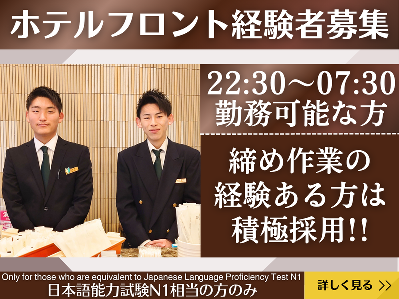 対象となる方 | 求めている人材 ✅日本語能力はN1相当以上が必要です (電話対応やチェックイン業務のため) ⭐業務に必要な日本語の読み書きができる方 ⭐経験者歓迎 ⭐ブランクOK ⭐無資格OK ⭐細部にまで気を配ることができる方 ⭐コミュニケーション能力が高く、 各種対応がスムーズに行える方 <<こんな方も歓迎✨>> ・人と話すことが好きな方 ・思いやりを持って業務に取り組める方 ・ホテルや旅館のフロント経験者 ・アパレルなどサービス業の経験者 ・居酒屋やレストランなどでの 接客経験を活かしたい方 -・-・-・-・-・-・-・-・-・-・-・-・-・-・-・-・-・-・-・-・- ⏩年齢不問 ⏩幅広い年代活躍中! ⏩セカンドキャリアを応援! ⏩ミドル世代活躍中 ⏩シニア活躍中 |