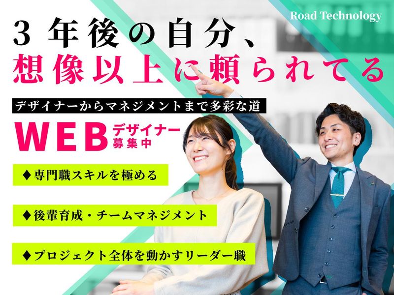 職種/仕事内容 | 仕事内容 WebサイトやLPの制作をお任せします。 HTML・CSS・JavaScriptを使ったコーディングを中心に、デザインやアニメーションの要素も取り入れながら幅広い案件に携われます。 バナーや動画広告の制作に挑戦する機会もあり、Adobe Premiere ProやAfter Effectsを活用して動画編集・映像制作スキルを磨くことも可能です。 未経験の方は研修で基礎から学べるので安心。 将来的にはWebと映像を組み合わせた様々なクリエイティブな表現が出来る、総合クリエイターを目指せる環境です。 ⸻ ■ 社員インタビュー(26歳/前職:カフェスタッフ) 「未経験からの挑戦でしたが、研修でWebの基本を学びながら、趣味で触っていた動画編集のスキルも活かせました。今はWebサイトのコーディングだけでなく、Premiere ProやAfter Effectsを使ってYouTube・TikTok・Instagramなどの簡単な動画制作にも携われています。案件選択制で自分のやりたい分野を選べるので、着実にスキルアップできています。将来的にはWebも映像も扱える総合クリエイターを目指したいです。」 ⸻ ★完全未経験からWEBデザイナーデビュー …………………………………………………… ●WEBデザインに興味はあるけど経験がない ●専門の学校で勉強していたわけでもないし ●コーディングって難しそう そんな方も安心してスタートできるように、 充実のサポート体制を整えています! 入社後は、WEBデザインの基礎知識から、 実務で役立つ考え方やツールの使い方まで、 順を追って少しずつ身につけていける 流れになっています。 また、プロジェクトは基本チーム制なので、 「これで合ってるかな?」と不安なときも、 すぐに相談できる環境です◎ ★ライフスタイルに合わせた働き方が叶う★ …………………………………………………… 働く場所や時間も、あなたらしく――。 フルリモートOKなので、 通勤ラッシュに巻き込まれることもなし! 自宅でのんびり朝を迎えたり、 終業後は趣味の時間を楽しんだり。 仕事もプライベートも、 ムリなく両立できます◎ \さらに/ ◆土日祝休み ◆年間休日120日以上 ◆残業少なめ!仕事終わりもゆとりあり 「ちゃんと働いて、ちゃんと休む」 そんな働き方ができる環境です♪ * * * あなたにお任せしたいのは――、 IT・Webサービス関連のあらゆる コンテンツ制作に関わるデザイン・コーディング業務。 内容はプロジェクトごとにさまざまで、 チームでアイデアを出し合いながら 進める案件もあれば、 ときにはクライアントとの やりとりに参加することも。 「自分の関わったものが世に出て、 多くの人の目に触れる」 そんなやりがいを感じながら、 “総合力”も身につけられるポジションです! >>★ある程度経験を積んだあとは、 働き方やキャリアの選択肢がグッと拡大。 たとえば… ■WEBデザイナーとしてスキルを極める道 ■後輩の育成やチームマネジメントを担う道 ■プロジェクト全体を動かす道 …など、多彩なキャリアパスを描けるのも、 Road Technology(ロードテクノロジー)で働く魅力です。 あなたの新しい挑戦を、私たちと一緒に。 Road Technology(ロードテクノロジー)で、 自分だけの「道」をつくっていきましょう! |