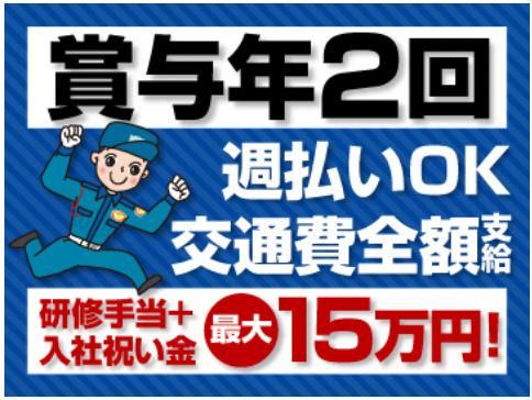 待遇・福利厚生 | 【保険制度】 雇用保険、労災保険、健康保険、厚生年金 【福利厚生】 待遇・福利厚生 【福利厚生】 ◆週払いOK ◆交通費全額支給 ◆社会保険完備 ◆制服貸与 ◆資格取得支援 ◆賞与年2回(規定) ◆社宅 ◆定年65歳/規定(再雇用制度あり) ◆専用アプリで勤怠報告可(来社不要) ◆研修手当3日間/1日9000円+食事手当1日1000円 ◆入社祝い金(規定)/15勤務2万円・30勤務3万円→合計5万円! |
