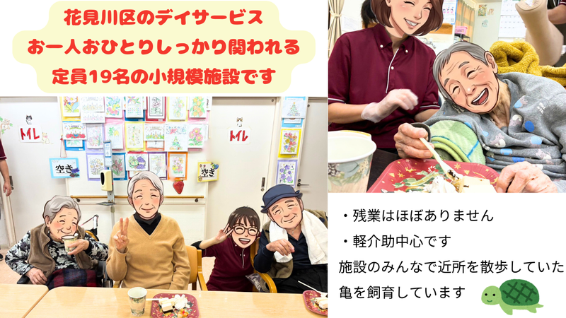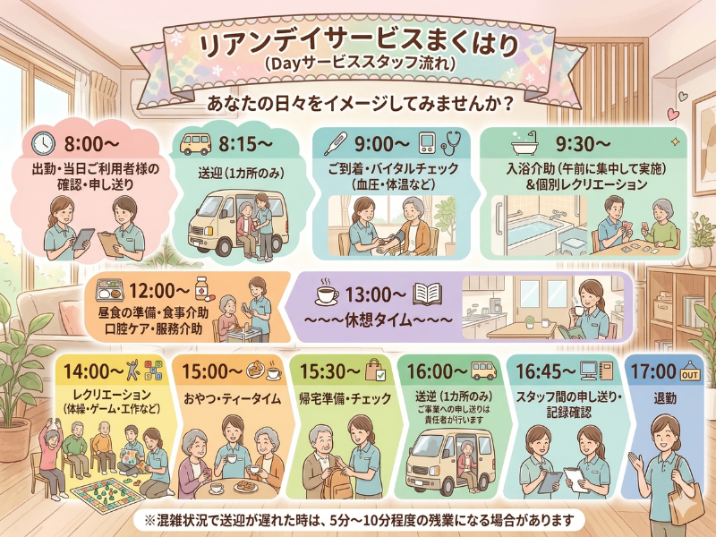 職種/仕事内容 | 仕事内容 みまもりや軽介助がメイン。 ==☆具体的な具体的なお仕事内容☆== ▼デイサービス全般のお仕事 ◎入浴介助(脱衣~着衣まで) ◎排泄介助(誘導から移動サポート中心) ◎食事介助(調理なし・配膳・見守りが中心) ◎送迎業務(1つの施設とデイの往復のみ) ◎レクレーション(折り紙・ぬり絵・歌) ※10人乗りハイエースの運転業務 ※運転に不安がある方はご相談ください。 ※要介護2~3の方がほとんどです ==☆よくある1日の流れ☆== 8:00~ 出勤 8:15~ お迎え(1カ所のみ) 9:00~ ご到着 9:30~ 入浴介助とレクリエーション 12:00~ 昼食・食事介助・服薬介助など 13:00 ~~~~~休憩タイム~~~~~ 14:00~ レクリエーション 15:00~ ティータイム 16:00~ 送迎(1カ所のみ) 17:00 退勤 ※ご家族などへの申し送り業務はありません ※渋滞状況で送迎が遅れた時は5分~10分程度の残業になる場合がまれにあります |