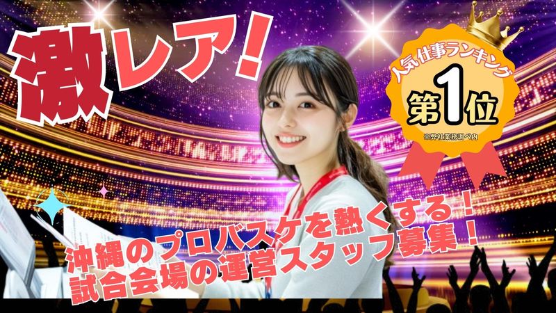 職種/仕事内容 | 仕事内容 【バスケット試合会場案内スタッフ募集】 ◇プロバスケットボールチームの試合会場(沖縄アリーナ)でのお客様対応をお任せします。 地元沖縄チームを支え、ファンと一緒に会場を盛り上げる、やりがいのあるお仕事です! (内容) ①チケット対応: 入り口でお客様のチケットを確認し、笑顔でお迎えします。 ②座席案内: 会場内でのお客様をスムーズにお席へご案内します。 ③来場者誘導: お客様が安全に移動できるよう、丁寧な声かけで誘導します。 難しい業務はありませんので、未経験の方もご安心ください。先輩スタッフがしっかりサポートします!一番大切なのは、来場者様へのおもてなしの心です。 ◇勤務地 沖縄アリーナ (沖縄県沖縄市山内) 沖縄高速道路「沖縄南IC」より車で5分 マイカー・バイク通勤OK! (無料駐車場あり) |