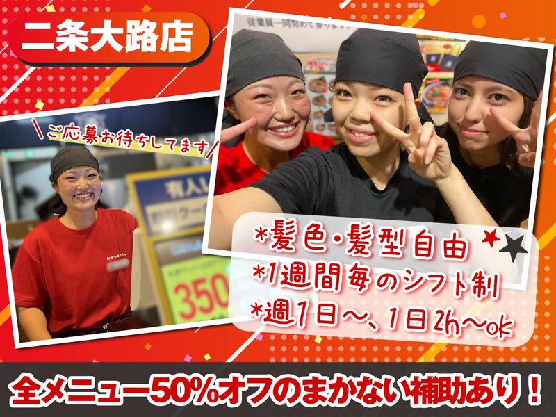 待遇・福利厚生 | 【保険制度】 雇用保険、労災保険、健康保険、厚生年金 【福利厚生】 待遇・福利厚生 【福利厚生】 ■髪型・髪色自由 ■制服貸与 (Tシャツ・バンダナ・腰エプロン) ■食事補助制度あり(全メニュー50%引き) ■有給休暇制度あり (勤務開始日より6ヶ月経過で付与/日数は勤務時間による) ■車・バイク通勤可 ■昇給あり ■履歴書不要 ■店内禁煙 |