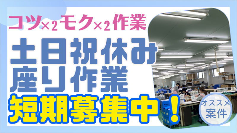 職種/仕事内容 | 仕事内容 〈 *3ヵ月~6ヵ月間の短期募集* 〉 座りながらの軽作業なのでラクラク♬ 土日祝休み/家庭との両立にもぜひ! ✓選べる2つの時間帯/残業なし ・・・・・・・・・・・・・・・・・・・・・・・・・・・・・・・・ ✓3ヵ月~6ヵ月の短期募集 ・・・・・・・・・・・・・・・・・・・・・・・・・・・・・・・・ ✓土日祝休み ・・・・・・・・・・・・・・・・・・・・・・・・・・・・・・・・ ✓コーヒー無料で飲み放題♪ ・・・・・・・・・・・・・・・・・・・・・・・・・・・・・・・・ ✓座り作業で体力の負担一切なし ・・・・・・・・・・・・・・・・・・・・・・・・・・・・・・・・ / 家庭と両立する主婦さんや フリーターさんが多数活躍中♬ \ 未経験の方も積極採用中! 座りながらのシンプル軽作業なので どなたでも無理なく始められる◎ ▼コツコツ・モクモク作業――――――― プラスチックの板に部品を貼り付けたり 組み立てをする作業をお任せ! 難しい作業は一切ありません◎ 【こんなお悩みにもお勧め!】 ┈┈┈┈┈┈┈┈┈┈┈┈┈┈ >まだ子供が小さいから学校の間に… >子育てがひと段落したから無理なく! >1日立ちっぱなしで足がパンパン… >人と話すよりも黙々作業が好き! などなど 主婦さんからフリーターさんまで 性別や経験問わず人気の短期案件♬ 朝はゆっくり・夕飯作りにも余裕を ▶10:00~16:00 収入重視派 ▶9:00~17:00 など働く時間帯も希望に合わせて 相談できるので、 とにかく働き易い環境が魅力なんです! まずはお気軽にご応募お待ちしてます♬ |