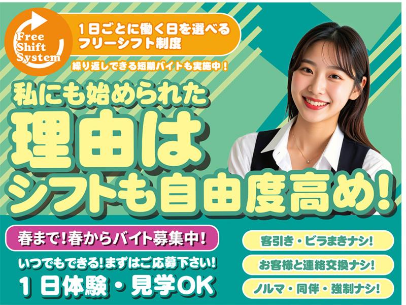 休日休暇 | 休暇・休日: 年中無休 週1日~勤務可能 シフトは自由(自己申告制)※働く時間や日数を自分で決められる! ※3ヶ月以上の勤務の場合は、単発勤務(1日のみ)もOK! |