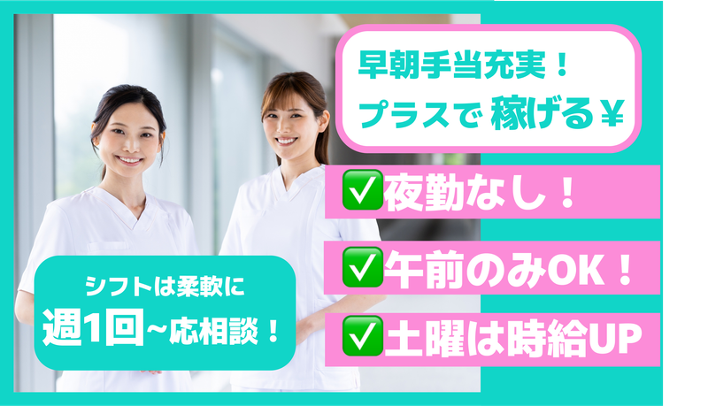 勤務時間 | シフト制 勤務時間詳細 下記[1]~[4]のシフトいずれか *勤務日希望・時間の調整は可能 勤務条件・希望により [1][2]午前のみ半日勤務、 又は[3]1日勤務、[4]午後のみ勤務 [1]7:30~12:00 [2]8:00~12:00 [3]7:30~15:00(休憩60分) [4]13:00~15:00(週3回/月・水・木) ※[3]週1・2回程度、6:30~の 早朝勤務あり(勤務回数は応相談) ※健診状況により勤務開始時間変動あり ※残業あり(月平均5時間) ※労働日数:週1~5日(応相談) |