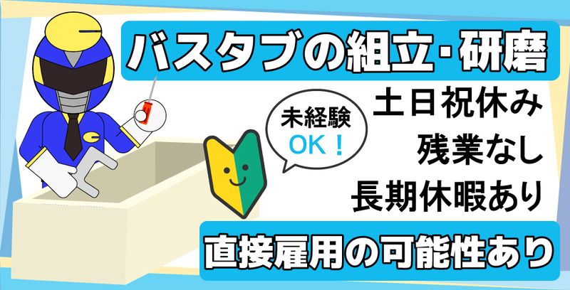職種/仕事内容 | 仕事の内容 【家庭用・介護用バスタブの組立スタッフ募集】 ご家庭や介護施設で使用されるバスタブの製造工場で、 組立や仕上げ作業を担当していただきます(^^)/ ≪お任せする作業内容≫ ・バスタブ内部への手すりの取り付け ・排水ホースの取り付け作業 ・表面を整える磨き作業(研磨機を使用) 工程ごとに丁寧なサポートがあるため、製造現場が初めての方も スムーズにスタートできます。 手順通りに進めていく作業が中心なので、ひとつずつ確実に覚えていけます。 ≪働く環境・待遇≫ ・大手企業グループの安定した事業基盤 ・立ち作業中心で、体を動かすことが好きな方に向いています ・頑張りに応じて直接雇用へのステップアップも目指せます ≪働きやすいポイント≫ ・土日祝休み(※会社カレンダーに準ずる) ・年間休日120日/長期休暇あり(年末年始・GW・夏季) ・残業なしで、オン・オフのメリハリをつけて働けます ・無料駐車場完備・制服貸与(上下) ・受動喫煙対策あり(屋外喫煙所設置) 現在は20代~40代の男性スタッフが中心となって活躍しています(*^-^*) 製品を手掛ける実感があり、日々の作業に集中できる職場です。 工具の使い方や作業の進め方は、現場で丁寧に教えてもらえます。 「手を動かす仕事が好き」「長く働ける職場を探している」 そんな方におすすめです(^^♪ ★本求人にご興味をお持ちの方は、応募する!より必須項目記載の上、 お問合せ下さい。 (お電話でのお問合わせ先:0120-67-3244 ※平日9時00分~18時00分) |
