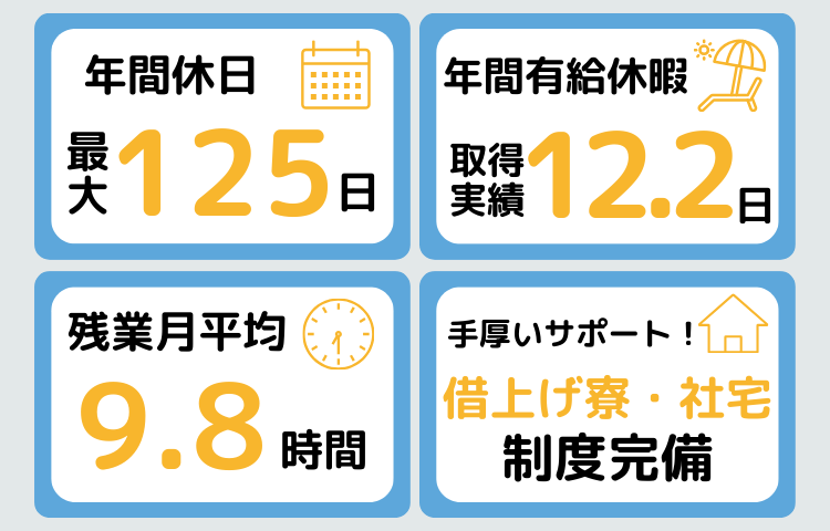 休日休暇 | 休日休暇 年間休日最大125日 完全週休2日制(土・日)/祝日/GW、夏季、年末年始 ※上記は、配属先のカレンダーに準ずる ・有給休暇(年間有給休暇取得実績:12.2日) ・産前・産後休暇 ・育児休業 ・介護休業 ・特別休暇 ・慶弔休暇 |