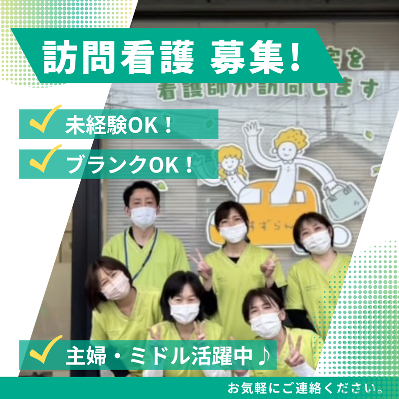 職種/仕事内容 | 仕事内容 ━━━━━━━━━━━━━━━━━━━━ ⭐賞与4ヵ月分!高収入も目指せる◎ ⭐年間休日117日!基本土日祝休み! ┗※土曜日は交代制で勤務(午前中のみ) ⭐通勤手当は上限なし!全額実費支給◎ ⭐オンコールなし! ⭐充実福利厚生あり! ⭐ブランクOK!久しぶりのお仕事の方も♪ ⭐30~50代の中高年・主婦さん活躍中♪ ⭐転居を伴う転勤なし!広島県に根付く! ━━━━━━━━━━━━━━━━━━━━ あなたの「心」と「技術」が、 誰かの「日常」を彩る。 地域密着型の訪問看護師を募集します!✨ |◤ お仕事内容✨◢|  ̄ ̄ ̄ ̄ ̄ ̄ ̄ ̄ ̄ ̄ ̄ ̄ ̄ ̄ ̄ ̄ ̄ ̄ ̄ ̄ 単なる看護ではない。 「生活」を紡ぐ訪問看護の醍醐味 在宅療養されている ご利用者様のご自宅を訪問し 以下のような業務を通じて、その方らしい 生活をサポートしていただきます◎ ✅ 日々の生活を支えるケア ┗ 療養上のお世話、身体介護 ✅ 医療的な専門知識を活かす ┗ 医療処置、医療機器の管理、服薬管理 ✅ 「できる」を育む支援 ┗ 機能訓練、リハビリテーション補助 ✅ ご家族の安心を育む ┗ 介護指導、精神的なサポート ⏩訪問エリア 広島市中区・南区・東区・西区・佐伯区 安佐南区・安芸区・廿日市市 安芸郡府中町・海田町・熊野町・坂町 ⏩訪問件数 1日:4~5件程度 <<ある1日の流れ>> 9:00 スケジュールや情報共有 9:30 利用者様の状態に合わせた訪問準備 10:00 訪問(1日2〜3件程度) 13:00 お昼休憩 14:00 訪問(1日1〜2件程度) 17:30 訪問内容の記録作成 18:00 帰宅 ⏩訪問看護のやりがいポイント  ̄ ̄ ̄ ̄ ̄ ̄ ̄ ̄ ̄ ̄ ̄ ̄ ̄ ̄ ̄ ̄ ̄ ̄ ̄ ̄ 私たちの訪問看護は、 単に病気を診るだけではありません。 利用者様が長年培ってきた 「生活の営み」に寄り添い、 喜びも、苦しみも、すべてを分かち合う 「人間味あふれる看護」がここにあります! 心が震える瞬間を、 分かち合える仲間と共に。 当社の訪問看護師は、 利用者様やご家族との深い絆の中で、 言葉では言い尽くせない 感動を味わっています。 また多くの先輩スタッフが、病院勤務から 「患者様ともっと深く関わりたい」という 想いで訪問看護へと転身し、 充実した日々を送っていますよ◎ ◤ すずらん薬局グループについて✨◢|  ̄ ̄ ̄ ̄ ̄ ̄ ̄ ̄ ̄ ̄ ̄ ̄ ̄ ̄ ̄ ̄ ̄ ̄ ̄ ̄ 「すべての人にやさしい薬局、 訪問看護事業でありたい」 ――この想いを胸に、私たちは 「健康と福祉と情報ステーション」として 地域社会に深く根差した 医療サービスを提供しています! 広島市内中心に 17店舗の薬局を展開する当社は 現在、108名の薬剤師を含む 206名の多様な専門職が在籍し 多角的な視点から地域の健康を 支えています。 病院では得られない 患者様の**「いつもの暮らし」**に 深く入り込み、その方の人生に 寄り添う訪問看護。 私たちと一緒に、医療のその先にある かけがえのない日常を守る お仕事をしませんか? ⏩訪問看護ステーションすずらん  ̄ ̄ ̄ ̄ ̄ ̄ ̄ ̄ ̄ ̄ ̄ ̄ ̄ ̄ ̄ ̄ ̄ ̄ ̄ ̄ 作業療法士:1名 看護師:6名 男性:女性=1名:6名 30代:1名 40代:2名 50代:3名 60代:1名 |