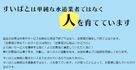 対象となる方 | 求めている人材 <必須条件> ●要普通免許(AT限定可) <歓迎条件> ●前向きに一生懸命取り組める方 ●「給水装置工事主任技術者」をお持ちの方は優遇 ●水道に関する知識不問、学歴不問、経験不問 <資格取得実績一覧> ●2級管工事施工管理技士・・・2名 ●給水装置工事主任技術者・・・6名 ●排水設備工事責任技術者・・・3名 ●ガス消費機器設置工事監督者・・・17名 ●貯水槽清掃作業監督者・・・8名 ●排水管清掃作業監督者・・・13名 ●ガス可とう管接続工事監督者・・・24名 ●給水装置工事配管技能者・・・2名 ●簡易内管施工士・・・1名 ●環境社会検定(eco検定)・・・4名 ●電話応対技能検定・・・23名 ●ビジネス実務法務検定・・・3名 ●秘書技能検定・・・4名 ●3級ファイナンシャルプランニング技能士・・・1名 |