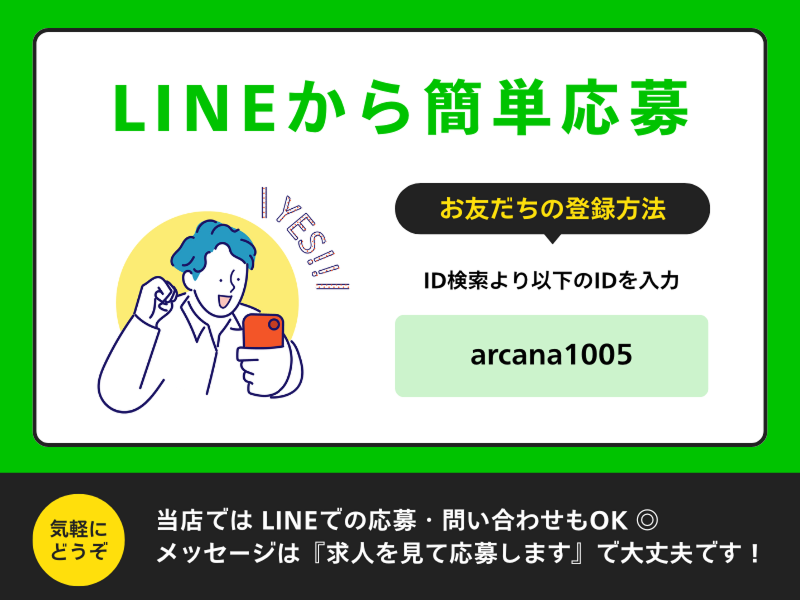 その他 | その他: ━━━━━━━━━━━━━━━━━━━ 【選考について】 * WEB、LINE、電話にて受付中 * LINE IDは『arcana1005』です * 応募後、お店より連絡します * カジュアル面談 * 履歴書不要 * 服装自由 ━━━━━━━━━━━━━━━━━━━ 雇用形態: アルバイト・パート 給与・報酬: 1,400円 (時給) 以上 |