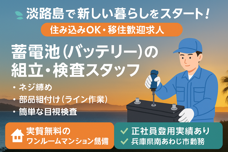 職種/仕事内容 | 仕事内容 【移住歓迎】兵庫県南あわじ市で働こう! 需要拡大中「蓄電池(バッテリー電池)」の組立・検査スタッフ募集 \ 淡路島ってこんなに楽しい! / 海、山、温泉、新鮮な食材、ゆったりした時間。 自然豊かで暮らしやすい環境が魅力の淡路島で、新しい生活と仕事を始めませんか? 需要拡大中!「蓄電池(バッテリー電池)」の組立・検査スタッフ募集! 今や蓄電池は、災害時の備えや再生可能エネルギーの普及、通信データの管理など、さまざまな社会課題を支える重要な製品です。 成長を続けるこの業界で、将来性バツグンのお仕事を始めませんか? 経験や知識は一切不要!未経験スタート大歓迎です。 【お仕事内容】 ・ネジ締め ・部品の組付け(ライン作業) ・簡単な目視検査 作業は一つひとつ丁寧に教えてもらえるので安心。 慣れてくると、モクモク・コツコツ進められるお仕事です! 【ここがポイント】 ✅ 業界未経験でもOK ✅ 安定して長く働ける職場 ✅ 正社員登用の実績あり ✅ 実質無料の寮完備 → 遠方からの応募も大歓迎! まずはお気軽にお問い合わせください。 新しいスタートを一緒に応援します! |