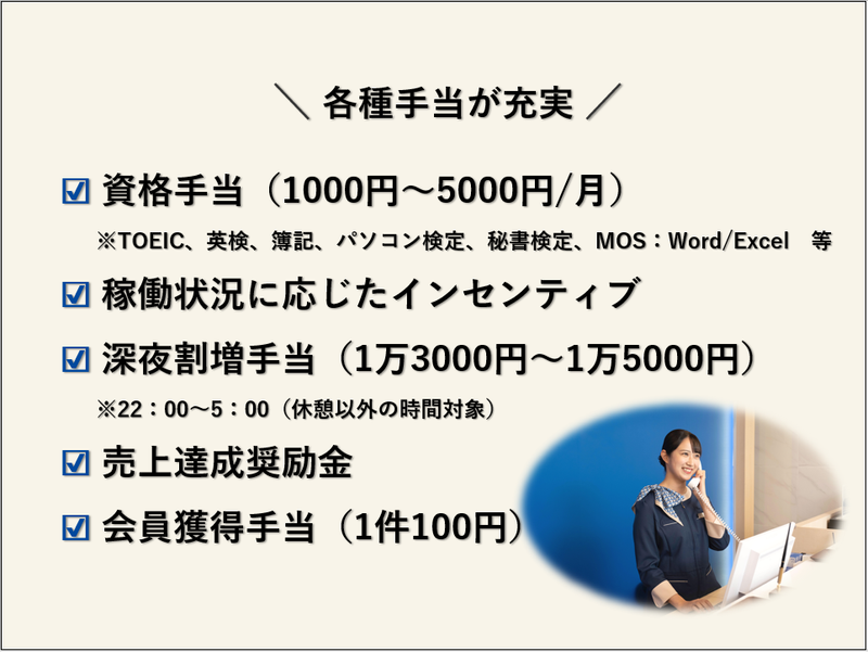 給与 | 月給205,000円以上 給与詳細 基本給:月給 20万5000円 〜 固定残業代:なし 【一律手当】 全員に一律で支払われる通勤・皆勤・家族手当金額:なし 全員に一律で支払われるその他手当金額:なし ◆入社後に対象資格を取得すると資格手当を毎月支給!(1000円~5000円/月) ※TOEIC、英検、簿記、パソコン検定、秘書検定、MOS:Word/Excel 等 ◆稼働状況によりインセンティブ支給あり ◆深夜割増手当あり(1万3000円~1万5000円) ※22:00~5:00(休憩以外の時間対象) ◆売上達成奨励金あり ◆会員獲得手当あり(1件100円) 【給与例】 給与例 <モデル年収> 入社1年目の20代男性:年収340万円 入社5年目の30代女性:年収390万円 |