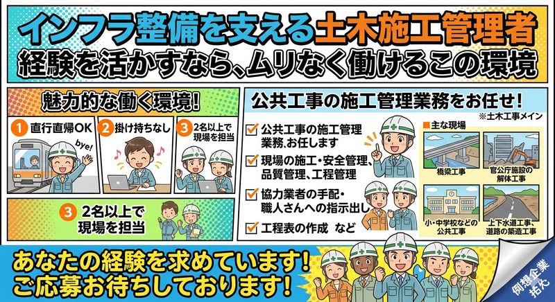 職種/仕事内容 | 【仕事内容】 【経験を活かすなら、ムリなく働けるこの環境】 ✅直行直帰OK ✅掛け持ちなし ✅2名以上で現場を担当 ▶公共工事の施工管理業務をお任せします。 ※土木工事メインとなります。 【具体的には】 ・現場の施工・安全管理、品質管理、工程管理 ・協力業者の選定、手配 ・職人さんへの指示出し ・工程表の作成 など 【主な現場】 ・橋梁工事 ・官公庁施設の解体工事 ・小・中学校などの公共工事 ・上下水道工事、道路の築造工事 ・住宅リフォーム工事 など ============================ 培った技術と経験を活かせる場所がここにある 現場を知るあなたの力が必要です! ============================ 土木施工管理のご経験がある方はぜひご応募ください! 〇家族手当や資格手当あり 〇週休2日制・資格取得支援あり 〇寮・社宅制度、各種手当多数あり 充実の福利厚生で働きやすさも抜群。頑張ってスキルアップをした分は、資格手当もありますのでぜひご活用ください! =================== 仕事もプライベートも、 どちらも大切にできる環境。 =================== 残業は少なめで、仕事終わりの時間もゆったり確保できます。 直行直帰や現場内での事務処理など、効率的な働き方を取り入れているため、無理なく定時退社が可能です。 週末や長期休暇も取得しやすく、家族との時間や趣味の時間もしっかり楽しめる環境です。 仕事もプライベートも両立させながら、安心して長く働ける職場です。 ▶あなたのご応募お待ちしております! 【求人ID-MTA】 |