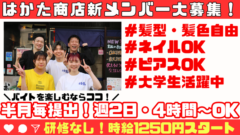 職種/仕事内容 | 仕事内容 ★ 年末に向けた大募集のチャンス ★ 駅目の前の「はかた商店」 バイトを楽しむならココで間違いなし♪ 飲食業経験者は時給UPの相談可能♪ ▼シフトの融通抜群!━━━━━★☆…・☆ ✅週2日~・1日4時間~OK ✅入り・上がり時間相談OK/終電考慮 ✅2週間ごとの自己申告シフト制 ✅平日のみor土日のみ相談OK ▼お勧めpoint ━━━━━━━★☆…・☆ ⭐絶品まかない有 ⭐友達や家族とも使える社割あり ⭐髪型・髪色自由 ⭐ネイル・ピアスOK *** ╭━━━━━━━━━━━━━╮ 大学生さん中心のお店♬ バイトを楽しむならココ! ╰━━━━━━v━━━━━━╯ みなさんも1度は見たことあるかも⁉ はかた商店で新メンバー大募集♬ ★年末に向けた大量募集のチャンス★  ̄ ̄ ̄ ̄ ̄ ̄ ̄ ̄ ̄ ̄ ̄ ̄ ̄ ̄ ̄ ̄ 大学生さんや20代の若手が 中心に活躍中の楽しいお店です♬ 自由度の高いお店で自分らしく 楽しく働けるのが何よりの魅力* 「働くってこんなに楽しいの?」 そんな働き方を叶えます♬ 今なら同期がたくさんなのも 嬉しいpointですよ⸜(ˆᗜˆ˵ )⸝♡ ●ホールスタッフ ・接客 ・オーダー取り ・お料理やドリンクの提供 ・テーブル案内 ●キッチンスタッフ ・簡単な盛り付け ・ドリンク作り ・配膳 など! ★未経験も大歓迎です! まずはお気軽にご応募ください♪ |