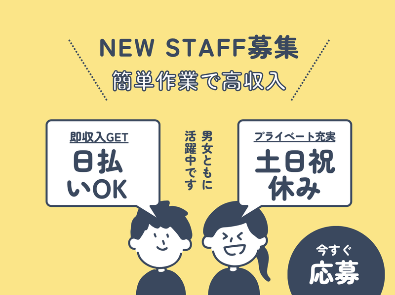 対象となる方 | 求めている人材 *未経験スタート歓迎! *20~50代活躍中! *初派遣、久々パートの方も応援! ▼こんな経験がある方も大歓迎 ・倉庫でのピッキング作業 ・構内作業や検査業務 ・工場内での製造サポート ・シール貼り、ライン作業 など |