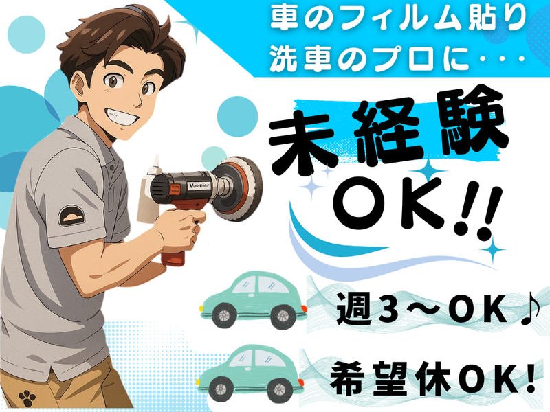 職種/仕事内容 | 仕事内容 【新着求人】 アルバイト・パート募集!! ――――――――――――――――― ★時給1,100円!しっかり稼げる高時給 ★週3日~!短時間・扶養内OKで両立◎ ★未経験から一生モノの専門技術を習得 ――――――――――――――――― 《お仕事の詳細》 お客様の愛車をトータルで 美しくするお仕事です。 <メイン業務> ・車のフィルム貼り (カーフィルム施工) <その他業務> ・洗車、車内清掃 ・ボディ磨き、コーティング 「フィルム貼り」は特殊な技術ですが、 最初の1ヶ月は研修でしっかりと 技術を教えますのでご安心ください! マニュアル完備で、未経験から 安心してスタートできますよ。 <会社・職場の魅力> ・正社員登用実績多数あり! ・資格取得支援制度でスキルUP ・大手ディーラー様との取引が多く、 業績も安定しているので安心です。 ――――――――――――――――― 《看板犬と働く癒しの職場》 20代~40代の社員が活躍中! 看板犬のテルくん・ココちゃんが 毎日お出迎えしてくれます。 ワンちゃんに癒されながら 楽しく働ける職場です! ――――――――――――――――― |