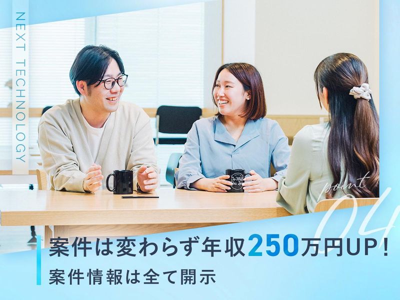 職種/仕事内容 | 仕事内容 ⭐ 理想の働き方が叶う場所 ⭐ 【1】全国どこからでも好きな場所で働ける 【2】全員が年収UPを実現しました! 【3】案件情報全開示、自由に選択可能 【4】残業月平均9h・年休135日・副業可 【5】スキルアップ・サポート充実 ※詳細は下記、【アピールポイント】へ <具体的な業務内容> 情報技術に関する専門的なスキル・知識を活用し、システム開発やITインフラの設計・構築・運用を行います。 <案件例> ■AIエージェント開発 工程:要件定義~テスト 環境:Python,TypeScript,React,Next.js,Node.js,GO,Kubernetes,Terraform,AWS ■電子コミックサービス開発 工程:設計~テスト 環境:TypeScript,React,Node.js,JavaScript,PHP,AWS ■次世代ブロックチェーンサービス開発 工程:設計~テスト 環境:GO,GCP,iOS,Android,Swift *今後は受託開発や自社サービスにも力を入れていきます! …………………………………………… \ アピールポイント / 【1】全国どこからでも好きな場所で働ける 「子育てと両立しながら」 「慣れ親しんだ土地で」など、 生活に合わせ全国から活躍中! ★リモート率90% ★働く場所を自由に選択 【2】全員が年収UPを実現しました! 業界最高水準!"80~95%"の高還元率で、 入社したメンバー全員が年収アップを実現! 【3】案件情報全開示、自由に選択可能 単価/内容/期間など、案件情報は全て開示。 「興味のある案件へ」「スキルに合わせて」 などの希望に合わせ自由に選択ができます! 【4】残業月平均9h・年休135日・副業可 働きやすさバツグン! 社員の声を基に福利厚生を日々アップデート。 ★服装自由 ★フリードリンク完備(生ビールも!) ★全てのオフィスが駅直結 【5】スキルアップ・サポート充実 動画学習(Udemy) や、外部講師を招いたAI勉強会など、 社内の声から実現した制度も!常に学べる環境を用意。 経験が少ない技術領域に挑戦する際には、 経験豊富な先輩エンジニアとともに案件に入ることも可能です! …………………………………………… 当社の魅力についてもっと知りたい方は、 下記URLをチェック! ◆note(社員インタビューあり) https://note.com/nexttech/ ◆Qiita https://qiita.com/organizations/nexttechnology/profile ◆採用HP https://nexttechnology.jp/recruit/ ◆広報 https://x.com/NextTechPR ◆社長SNS https://x.com/wadagaku |