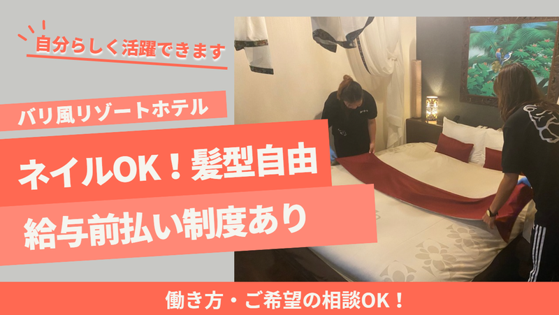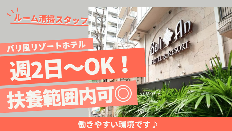 職種/仕事内容 | 仕事内容 *週2日~OK!自分の生活に合わせて都合よく働ける *髪型髪色、ピアスネイルも自由!自分らしく働く◎ *未経験歓迎、先輩スタッフが丁寧に業務をお教えします |具体的な仕事内容| ・2人1組でのベッドメイキング ・客室清掃 ・館内外の掃除 ・共用部のお掃除など 20~50代のスタッフ中心に 活躍中です。 未経験スタートOK! 先輩スタッフがイチから お教えしますのでご安心ください! 丁寧な接客、立ち振舞いや、 マナーが自然と身につくので 学生さんには将来へのスキルにも 繋がりオススメです!! 常に2人体制で対応するので、 分からないことはすぐに確認できる環境! だから未経験でも安心して始められます♪ |シフト柔軟で働きやすさバツグン| 週2日~OK! シフトはかなり融通が利くので、 ご自身の生活や都合に合わせて、無理なく勤務が可能です。 早い時間に上がって、自分の趣味の時間にあてたり、 授業や予定が終わってから夜の短時間で働いたり、、 スキマ時間を活用できるので、無理なく続けられるのが嬉しいポイント! |個性豊か、明るい雰囲気の職場| 社員スタッフも含め、とにかくフランクな方が多いので、 働きやすいと評判です。 上下関係など関係なく、気軽に業務について相談出来たり、時には趣味について話したり。 自分らしくお仕事することができます! |