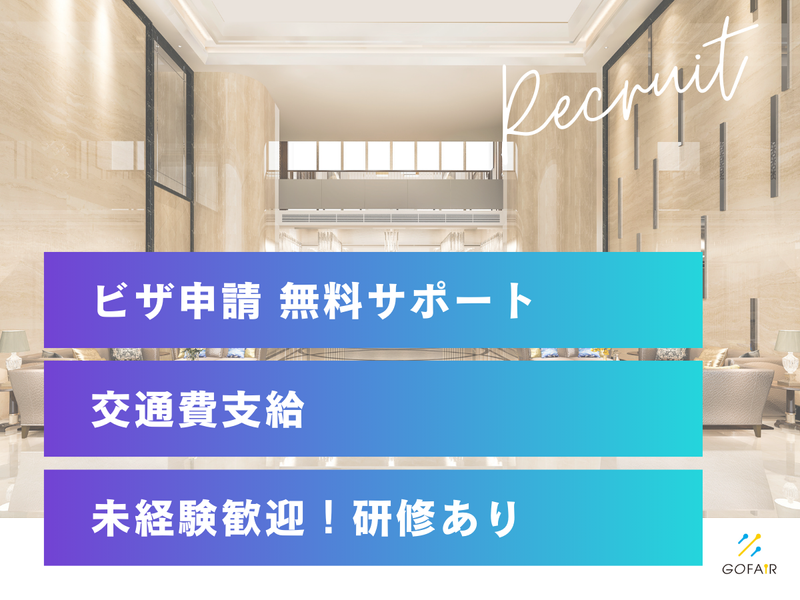 待遇・福利厚生 | 【保険制度】 雇用保険、労災保険、健康保険、厚生年金 【福利厚生】 待遇・福利厚生 【福利厚生】 社会保険完備 有給休暇制度有り 交通費全額支給 就労ビザの無料サポート 日本語オンラインレッスン受講(5000円分) |