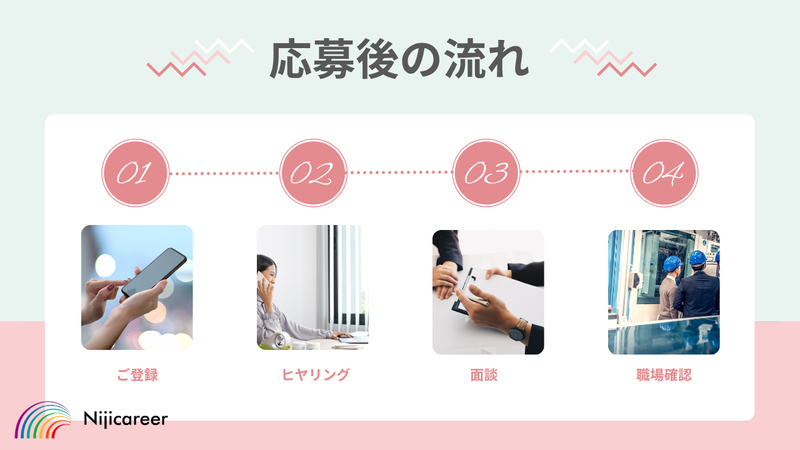 待遇・福利厚生 | 【保険制度】 雇用保険、労災保険、健康保険、厚生年金 【福利厚生】 待遇・福利厚生 【福利厚生】 ▼社会保険即日加入可能 ▼日払い制度あり ▼WワークOK ▼交通費支給 ▼昇給制度あり ▼無料駐車場完備(一部除く) ▼定期健康診断実施 ▼お友達紹介キャンペーン実施 ▼提携グランピング割引施設多数 ▼有給消化率100% ▼介護・看護・産休・育児・傷病休暇有 ・・・・・・・・・・・・・・・・・・・・・・・・・・・・・・・・・・・・・ 静岡県で働くなら… ニジキャリアにお任せ! ≪女性営業が多数在籍≫ ◎丁寧なカウンセリング、 手厚いフォローあり! ◎経験豊富なカウンセラーが 「はじめての派遣」もトータル サポート! ◎入社前にはリアルな職場情報を お伝えしミスマッチからガード! ◎困ったコトは何でも電話やメッセージ アプリでいつでも相談OK! スタッフ様のアフターフォローの徹底を モットーに伴走します! 「こんな風に働きたいな」などの希望は ぜひお聞かせください! あなたの理想が叶う職場、一緒に探して いきましょう♪ |