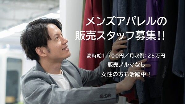 対象となる方 | 応募資格 【必須】 *土日祝日のいずれかの勤務が可能な方 *外国籍の方は日本での就労が可能な在留資格をお持ちの方 *就労ビザの申請・更新手続きをご自身で対応可能な方 【歓迎】 *性別不問 *アパレル経験者歓迎 *長期勤務できる方歓迎 *週5日勤務できる方歓迎 メンズブランドですが、女性スタッフも活躍中☆ \ こんな方にもぴったり / ・洋服、ファッションが好き ・販売経験を活かしたい ・オシャレなところで働きたい ・人と話すこと、提案することが好き ・人に喜んでもらえることが好き |