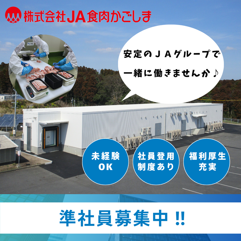職種/仕事内容 | 仕事内容 ✼┈┈┈┈┈┈ここがPoint┈┈┈┈┈┈✼ ✅安定のJAグループ ✅未経験の方も大歓迎! ✅充実の福利厚生 ✅正社員登用多数!無期契約が前提の募集! ✼┈┈┈┈┈┈┈┈┈┈┈┈┈┈┈┈┈┈✼ 準社員を募集いたします。 ※入社日については、応相談 【具体的な仕事内容】 ・お肉のカットやスライス ・盛付け ・パック作業 ・清掃 など ✨難しい作業は一切なし!未経験大歓迎✨ 業務に機械を使ったり、包丁でカットしたり することがありますが、操作の仕方や包丁の 扱い方は一から指導するので未経験の方も ご安心ください♪ ✼┈┈┈┈┈┈┈┈┈┈┈┈┈┈┈┈┈┈✼ ✨安定のJAグループ✨ JAグループの充実した福利厚⽣が整う環境で ⻑期にわたり勤続する社員が多数︕ ✅大人気の社員食堂 1食250円で食事がとれる食堂が大人気! 日々の食費も浮くためお財布にも優しい♪ ✼┈┈┈┈┈┈┈┈┈┈┈┈┈┈┈┈┈┈✼ ✨正社員登用実績多数!無期契約が前提✨ 準社員(契約社員)での採用とはなりますが 無期契約が前提です。 正社員への登用実績も多数あり、過去3年間 で51名の方が正社員となっています。 入社後、約2~3年で正社員登用される方が 多いです。 ※業務評価を通じて判断 ✼┈┈┈┈┈┈┈┈┈┈┈┈┈┈┈┈┈┈✼ ✨南九州市在住の方々を中心に活躍中✨ パックセンターのある南薩工場は 南九州市にあるため、その周辺に在住の方々 を中心に活躍されています。 ▼下記エリアから通勤されている方がいます ・鹿児島市 ・南九州市 ・南さつま市 ・枕崎市 ・指宿市 |
