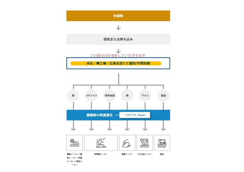 職種/仕事内容 | 仕事内容 ✅残業月平均10時間以内で17時退社! ✅寮完備! ✅福利厚生充実! ✅地球環境を支える社会貢献性の高い仕事 これからの時代なくてはならない仕事 【仕事内容】 非鉄金属・希少金属・産業廃棄物の再生資源の選別・中間処理。 ①建設現場や工場などから集められてきたものを、分析器などを使ってリサイクルできるもの・できないものに分別 ↓ ②リサイクル商品を納品する製造メーカーに合わせていろいろなサイズに圧縮・切断・破砕します。 ↓ ③リサイクルできないものは適切に処理 《取り扱うもの》 工場から出る廃材、機械類・廃車予定の自動車・バイク、学校・オフィスの不用品、エアコン 建築物の建設・解体時に出る廃棄物、廃プラスチック類・紙くず・木くず・繊維くず・ゴムくず・金属くず・ガラスくず・コンクリートくず及び陶磁器くず・がれき類・汚泥 《においなどについて》 工場内に匂いがこもっているという感じはありません。 排水等の掃除も行政の監督のもと徹底しているため、汚いという感じもありません。 材料を切断、溶接などの際に匂いが発生する場合もありますが、防塵マスクやゴーグルを支給して着用を義務づけています。 ==================== 光商について ==================== 資源の枯渇化が進む一方で、私たちの身のまわりにある工業用品や自動車などには、多くの非鉄金属・希少金属が使用されています。 それらの金属は「再生」することができ、そのリサイクルは社会的に重要な役割を担っているのです。 光商では、リサイクル・リユース・リデュースの「3R」の理念のもと、貴重な資源である非鉄金属・希少金属スクラップの回収及び再生に真剣に取り組み、循環型社会へ貢献しています。 |
