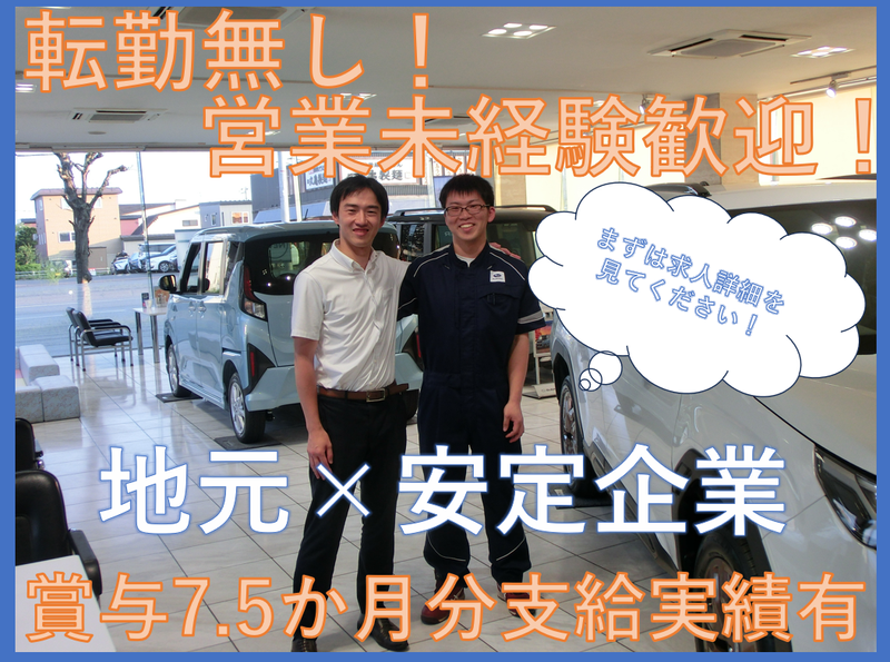 対象となる方 | 求めている人材 【必須条件】 ◆要普通自動車運転免許 ◆基本的なPC操作ができる方 (文字入力程度でOK) <歓迎条件> ◇接客経験がある方 ◇意欲的に業務に取り組める方 ◇Uターン・Iターン・Jターン歓迎 <こんな方におすすめ> ◇未経験からルートセールスを やってみたい方 ◇お客様とのコミュニケーション を楽しめる方 ◇自動車に興味があり、スバル車の 魅力を伝えたい方 ◇チームワークを大切にしながら 働きたい方 ◇地域密着型の企業で働きたい方 ◇地元で腰を据えて働きたい方 *・・*・・*・・*・・*・・*・・*・・*・・*・・* 営業未経験の方でも、充実した研修制度と 先輩社員のフォロー体制が整っているため 安心してスタートできますよ◎ *・・*・・*・・*・・*・・*・・*・・*・・*・・* |