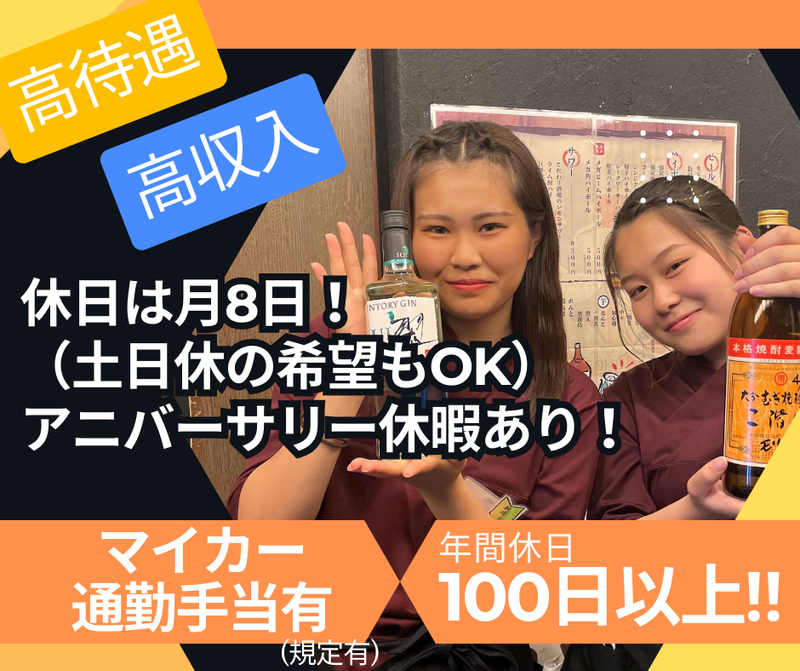 勤務時間 | シフト制 勤務時間詳細 総労働時間:1ヶ月あたり168時間 15:00~翌1:00 ※シフト制 ※休憩は60分有 ※配属店舗により変動有 |