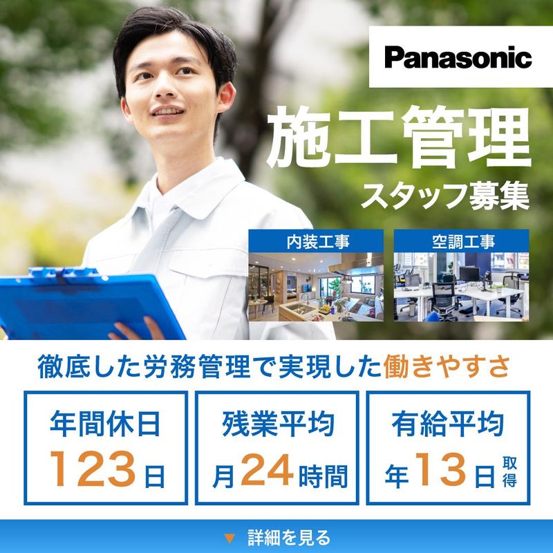 職種/仕事内容 | 仕事内容 パナソニック×トヨタ自動車の合弁会社 プライム ライフ テクノロジーズ(株)の一員! 【 年間休日123日 】 土日祝休み:休日出勤は振替休日取得必須! 【 有給取得日数13日 】 取得推奨日設定あり! 【 平均残業24時間 】 20時以降は事前申請必須! 大手ならではの徹底した労務管理のもと、 「心豊かな未来の町」を 一緒に創造していけるチャンスです! < 私たちのこと > パナソニックの くらしアップデートサービス、 トヨタ自動車の モビリティサービスを融合し、 家や建物だけにとどまらない まちづくりを目指して設立された プライム ライフ テクノロージズグループ。 行政・金融機関と連携して病院と マンションを一体化する複合施設の展開、 各地の遊休地を活用したまちづくりなど、 大都市への人口集中や少子高齢化などの 社会課題解決に向けた事業を進めています。 パナソニック建設エンジニアリングは その一員として、住宅設備販売や 工事を手掛けている会社。 建物だけでなく、太陽光設備や バイオマス発電設備など環境関連設備も 手掛ける事業領域の広さ、 また、内装まで手掛けられる深さもあり、 自分自身のスキルを確実に 広げていける環境があります。 < お任せする仕事 > 空調・給排水衛生等機械設備、 一部耐震工事などの新築、改修工事に 携わっていただきます。 安全管理や品質管理、工程管理、 コスト管理などを通じて、 工事のスムーズな進捗を支えていきます。 ビルや商業施設、学校や老健施設など、 手掛ける範囲や規模は様々。 80%が元請け案件で、お客様から 直接感謝の言葉をいただけるので 確かなやりがいを感じられます。 < キャリアアップについて > 階層別の研修をご用意しています。 特に、パナソニック100年の 経験と歴史から生まれた、 パナソニックエレクトリックワークス創研の 269種類にも及ぶ研修制度が あなたの成長をしっかりバックアップ。 資格取得は、取得のための研修費用から 当社が全額負担します。目標を持って、 将来のキャリアを築くことができます。 < 働きやすさを追求 > 建設業界の高齢化が進み、 労働人口減少にともなう長時間労働が 問題となっている中、私たちは 働き方改革にいち早く取り組んできました。 毎月の経営会議や労働組合と一緒に、 勤務時間の管理や有給・代休の取得に 向けたフォローなど社員一人ひとりの 勤怠管理を徹底しています。 無駄な残業は一切ありません。 20時を超えると、事前申請がなければ パソコンがシャットダウンされる システムを取り入れています。 このような取り組みが実を結びはじめ、 現在では若手比率に加え、 女性比率も業界ではトップクラス。 今後も、やりがいを持って、 健康的に働ける環境を追求し、 世の中に貢献していきます。 |