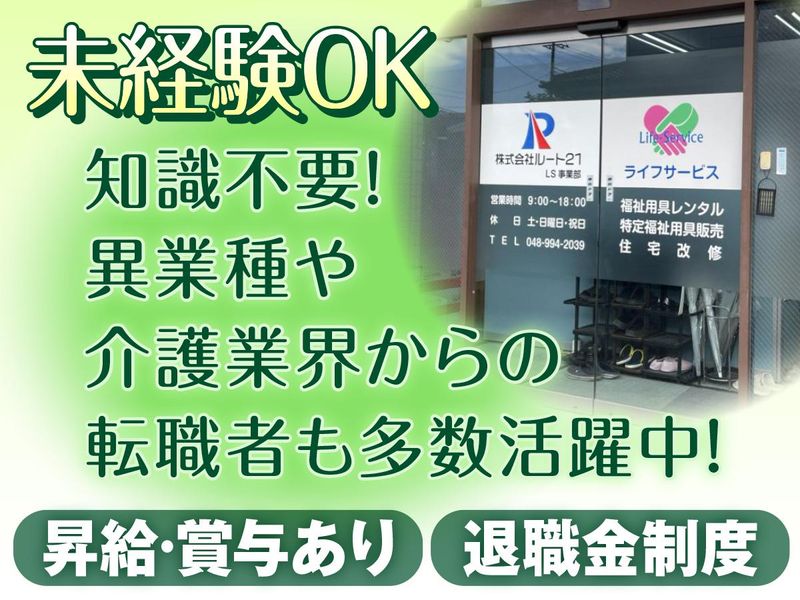 待遇・福利厚生 | 【保険制度】 雇用保険、労災保険、健康保険、厚生年金 【福利厚生】 待遇・福利厚生 【福利厚生】 ✅昇給・賞与あり(会社業績による) ✅交通費規定支給 ✅車・バイク通勤OK ✅確定拠出年金制度 ✅各種手当(役職・時間外・扶養) ✅資格取得支援制度 (福祉用具専門相談員、福祉住環境コーディネーター2級) |