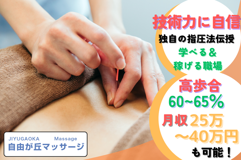 職種/仕事内容 | 仕事内容 << 求人のポイント >> ✅業務委託×鍼灸師募集 ✅経験が浅い方やブランクも歓迎! ✅鍼灸マッサージに力を入れているお店 ✅技術力が自慢!ツボの深いところを抑える独自の指圧法を伝授 ✅高歩合で高収入▶歩合率:60%~65% ✅受託時・受託後の費用負担ナシ! ✅週3日~OK!シフトの融通バッチリ! ガッツリ働きたい方も 家事と両立して働きたい方も大歓迎! ✅駅チカ店舗で通勤ラクラク - 【 仕事内容 】 - 主な業務は、施術(鍼灸マッサージ)を中心に、 受付対応、電話応対、予約管理などの サポート業務もお願いします。 当店の施術は、 自由が丘マッサージ独自の指圧技術に加え、 足裏やヘッドマッサージなど、 自分の得意な技術を組み合わせた オーダーメイドの施術を お客様に提供することが可能です! 単に鍼灸だけ・指圧だけの施術ではなく、 当店の鍼灸メニューには、 必ず指圧が含まれます! そのため、指圧の研修もしっかり行うので、 鍼灸だけでなく指圧の技術を身に着けたい方にはピッタリです! - 【 自由が丘マッサージ について 】 - 当店の施術は、指圧での施術と 鍼灸での施術に力をいれています。 特に力をいれているのは、 「宮路流経絡指圧」という 従来の指圧では届きにくい深部のコリや、 整形外科疾患による症状の改善において 効果が期待できる独自の指圧マッサージです! もみほぐしと比べて、 1点集中でツボの深くまで入るところが特徴! 従来の経絡指圧とは異なり、 深筋膜に的確に圧をかけることで、 経絡やツボを捉え、 気の流れを改善することを目指しています。 ※特に、首肩や腰の凝り、頚椎症、 ヘルニア、脊柱管狭窄症などによる痛みや痺れ、頭痛の改善に効果があるとされています。 多くのセラピストさんのマッサージは 腕の力を中心に使って行っていますが、 「宮路流経絡指圧」では ツボの深いところを押すために 体重を使ってマッサージを行います。 そのため、腕の痛みや疲れはほとんど無し! はじめのうちは指が痛いこともありますが、 慣れてくれば指の痛みもほとんどなく、 きっとご自身の身体にも負担の少ない 施術を行うことが出来るようになるはずです◎ このような技術の習得はもちろん、 鍛錬も欠かさず行える環境! 院長が直々に技術や理論を 覚えていただくための研修を行ったり、 週に2~3時間ほど先輩との練習会を実施しています! だからこそ当店は、 技術力に自信を持っていますので、 技術をしっかり学びながら、 スキルアップし続けたい方は大歓迎です!! - 【 ときわ台店について 】 - 店内はオレンジを基調とした 清潔感のある落ち着いた空間です! お客さんは常連さん 40代~50代の方が多いため、 新人さんにとっても安心して 施術しやすい環境です! 30代~50代スタッフ活躍中! 家事や子育てと両立して働くスタッフや ガッツリシフトに入って働くスタッフなど さまざまです! - 【 ホームページURL 】 - https://jiyugaoka-massage.com/ |