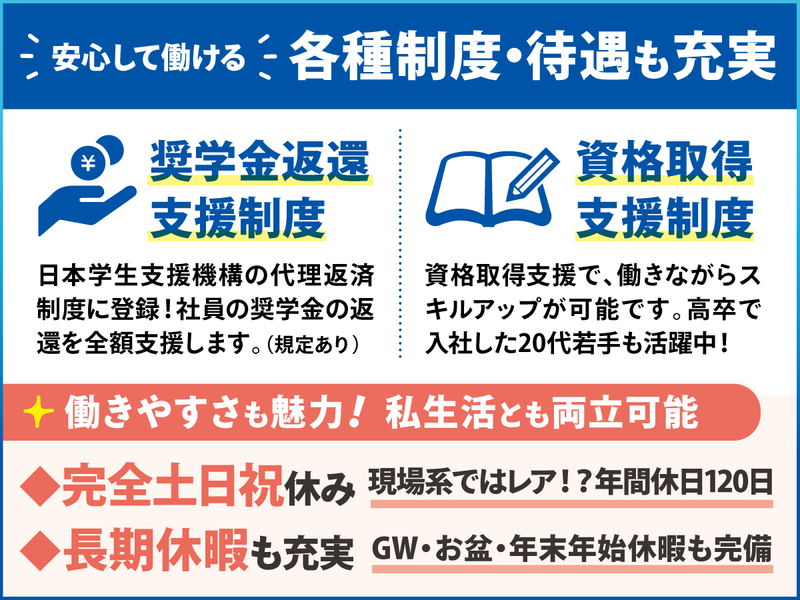 待遇・福利厚生 | 【保険制度】 雇用保険、労災保険、健康保険、厚生年金 【福利厚生】 待遇・福利厚生 【福利厚生】 *社会保険完備 *資格取得支援あり *制服あり(制服貸与) *研修制度あり *退職金制度あり *奨学金返還支援(代理返還)制度あり 【各種手当】 ・交通費支給(規定あり) ・資格手当(3000~3万円) ・技術手当(1万~5万円) ・扶養手当(配偶者1万円、子1人あたり5000円) |