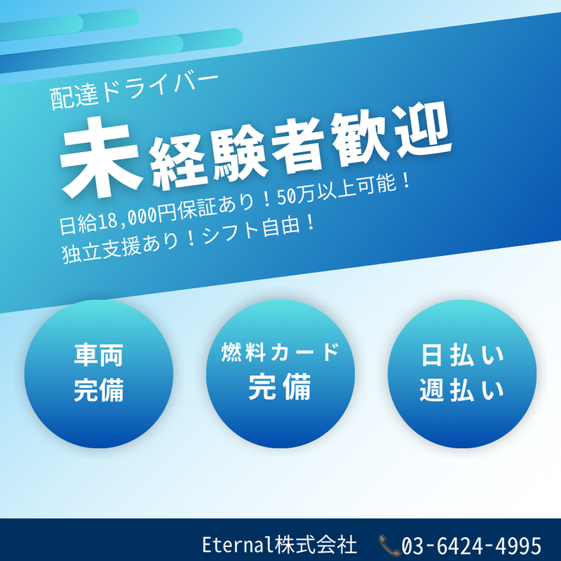 職種/仕事内容 | 仕事内容 \ 1分で応募完了!即勤務OK!! / ◎普通自動車免許があればOK! ◎未経験歓迎!外国人スタッフ活躍(※) ◎高収入OK!月収60万以上可! ◎シフト自由!週2日、3日もOK! ◎50代・60代の中高年も応援! ◎車両リースやガソリンカードあり ※入社段階で就労が認められる就労ビザを有する見込みのある方の採用実績あり ◆◇◆―――――――――――― 電話応募大歓迎!履歴書不要 TEL:03-6424-4995 ―――――――――――◆◇◆ 普通自動車免許さえあれば 未経験・ドライバーデビューも歓迎! 2021年開業の新しい会社は 働き方も報酬も今どきです★ (弊社独自の福利厚生あり) - 《 仕事内容 》 企業や一般家庭への荷物を届ける ドライバーのお仕事です。 ・車種…軽自動車(普免でOK) ・配達物…雑貨や日用品などの小物 ・エリア…東京・神奈川など選択可能(直行直帰OK) 配送エリアが狭いのが特徴で、 集荷エリアを中心とした 都内or神奈川への短距離配送です! - 《 仕事のポイント 》 業務に必要な車両や嬉しい待遇として ガソリンカードの支給あり、 不安な方は研修からスタートなど、 未経験者が始めやすい環境が しっかり整っています。 ミドル・シニアや外国人も活躍中! 日本語での日常会話ができればOKです。 ――――――――――――― ここがPOINT! ――――――――――――― ・加盟金なし、車両レンタル可能 ・ガソリンカード貸与 ・仕分け済みの商品を積み込み、 ナビアプリ通りに運転するだけ ・再配達の手間が省ける置き配も対応 ・不安な人は研修制度を受けられる ・勤務時間、日数の相談可能 都合に合わせてコントロール出来ます - 《 月収60万円以上可能! 》 週5日ベースなら月収60万以上可能! 週2・3日でも月収25~35万可能です! 日数は自由なのでお気軽にご相談を♪ (スタッフの平均月収45万円) もっと高収入を目指したい! という方はナイト便メインにしたり、 単価案件で活躍する道もあります! 単価案件でも日給1.8万円を保証します。 - 《 シフト日数自由! 》 ●春・夏は週5日でガッツリ、 秋・冬は週2-3日程度に調整 ●普段は週3日で働いて、 稼ぎ時のシーズンは週5日入って ガッツリ高収入を目指す なんて働き方も実現できます♪、 趣味や夢、子育てと両立する人や セカンドライフのために働く シニア・ミドルも活躍中です! - 《 正社員やCEOになる道も! 》 この仕事が気に入ったら 正社員登用制度を利用することも可能。 自分に合う仕事かしっかり見極められるので これからドライバー職を目指している方に 当社はピッタリです! 独立支援の制度もあるので、 将来は夢のCEOも目指せます! |
