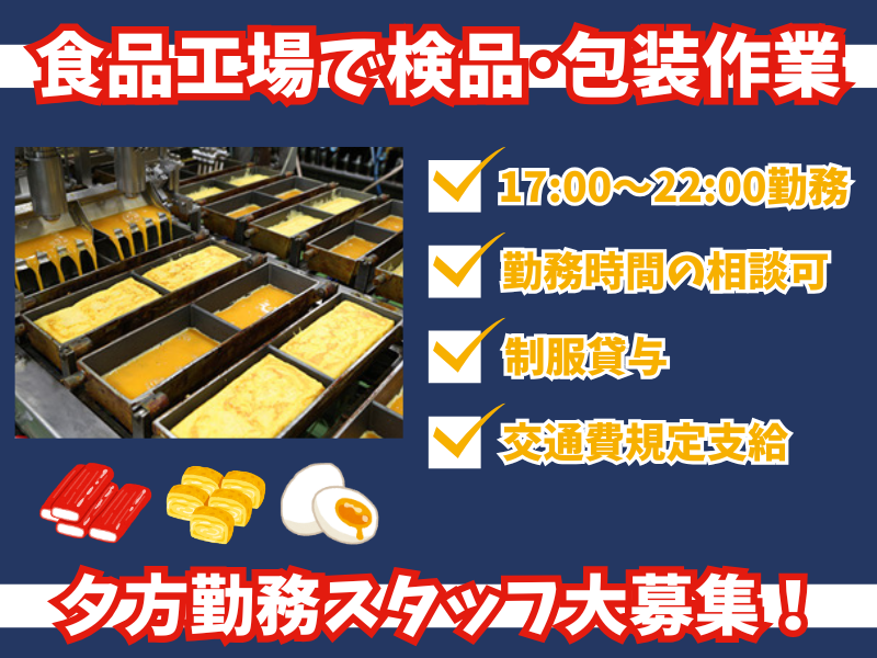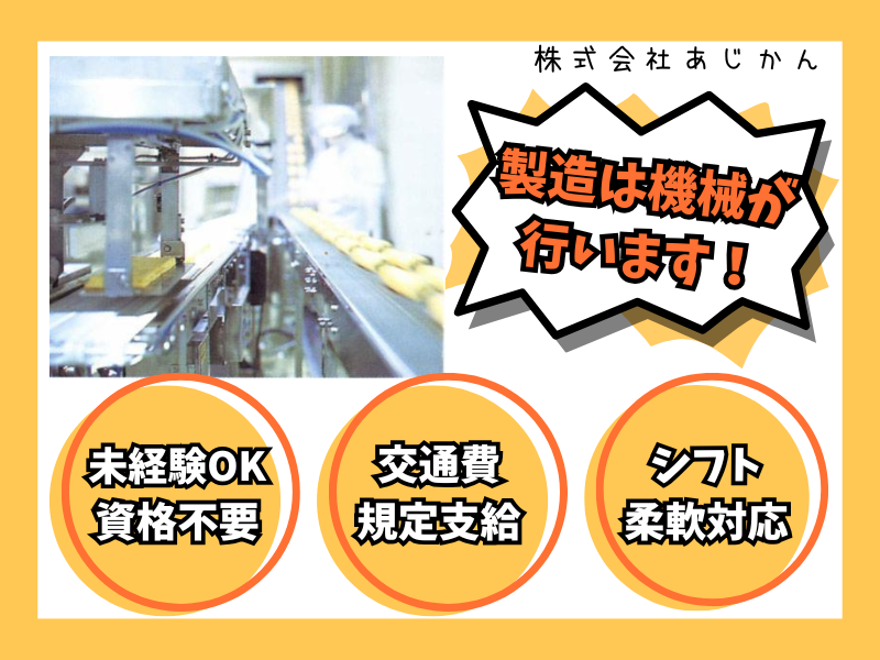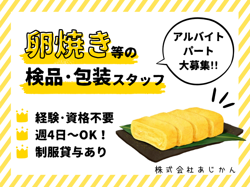 職種/仕事内容 | 仕事内容 ――――――――――――――――― ■ 玉子焼きなど業務用食品の製造 ■ ――――――――――――――――― ⋆⸜✨こんな方におすすめ✨ ⸝⋆ ⭐夕方から働きたい方にピッタリ♪ ⭐社会保険加入で安定勤務! ⭐勤務時間は柔軟に対応可能◎ ⭐未経験歓迎!資格不要! ⭐簡単ライン作業で初めてでも安心! ⭐制服貸与で事前準備は必要なし! 【 お仕事内容 】 スーパーのお惣菜やお弁当に入っている 食品に関わる製造のお仕事です! 玉子焼き・カニ風味かまぼこなどの製造ラインで 検品・包装などの製造補助作業をお任せします。 主なお仕事内容は、 ・製品の検品 ・包装作業 ・製造ラインの清掃作業 です。 実際の製造は機械が行います。 機械では補えない部分を皆さまに担当していただきます。 扱う食品は業務用が多いため、 製品のパッケージは見たことがないかもしれませんが、 スーパーのお惣菜やお弁当に入っているため とても身近で馴染みがあるものばかりです! 未経験の方でも取り組めるよう 製造ライン等は簡素化しています! マニュアルや指示書などもご用意していますので、 1つずつ覚えていきましょう! ほとんどの方が未経験からのスタートです! 周りのスタッフがしっかりとサポートしますので 初めてチャレンジする⽅も安⼼してご応募くださいね。 もちろん、製造業や工場での お仕事経験を活かしたい方も大歓迎です! まずはお気軽にお問い合わせください。 ――――――――――――― ■ 充実の待遇・福利厚生 ■ ――――――――――――― パート勤務の方でも 充実した生活と収入を確保できるよう 様々な福利厚生をご用意しています! ⭐創業60年の安定企業 安定した収入で長く働いていただけます! ⭐ライフスタイルに合わせた働き方が可能◎ お昼だけの短時間勤務もOK! 勤務時間・曜日、勤務開始日 などはお気軽にご相談ください! ⭐子育て中の方でも安心して働ける! 学校行事や発熱・体調不良など 急なお休みもシフト調整も柔軟に対応します◎ ⭐その他うれしい待遇たくさん! 〇通勤交通費 〇付加手当 〇定期健康診断 など ――――――――――――――― ■ 株式会社あじかんについて ■ ――――――――――――――― 当社は、一本の玉子焼から始まった 広島県に本社をおく食品メーカーです。 玉子製品、寿司用具材など主に業務用食品を製造し、 日本全国にあじかんの味をお届けしています。 現在は国内5工場と全国に営業拠点を構え、 新鮮な商品と安定供給できる体制を構築しております。 また、世界中に広がる日本食へのニーズに対して、 海外市場への販路拡大や日本食文化の普及にも 積極的取り組んでいます。 |