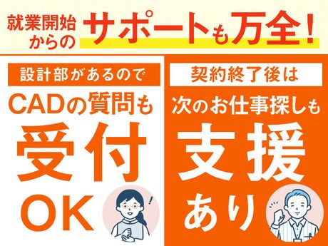 職種/仕事内容 | 仕事内容 \BIM・CADオペレーター派遣に特化した派遣会社/ 「自分に合った仕事を見つけられた!」という方多数! モノづくりが好きではじめたのに、 気づけば会社からメンバー育成を 期待されるようになってしまった…。 会社や組織にとって、人を育てることも重要だし、 大切な仕事であることに変わりはありません。 でも、自分が本当にやりたいことと 違う仕事をするのってけっこうきついですよね。 もし、あなたがそんなことに悩んでいるなら、 アットキャドでCADオペレーターをしませんか? アットキャドは、CAD専門の人材派遣会社。 あなたの希望にあわせてお仕事をご紹介するので、 生涯、現場で働くことが可能です。 また、2600社以上とお取引の実績があるため、 多種多様な案件、プロジェクトが揃っており、 あなたの希望にあったお仕事をご紹介できます。 案件の中には在宅が可能なお仕事や、 時間に融通のきくお仕事もあります。 ライフイベントで働き方を 変えなくてはいけなくなっても、 無理なくCADオペレーターを続けていけます。 ずっと現場で手を動かしていたい。 大好きなCADを極めていきたい。 そう思っているなら、 アットキャドがオススメです。 【おすすめポイント】 1…取引実績社数、2600社以上! 自分のやりたい仕事、自分のしたい働き方がきっと見つかります。 2…困った時に駆け込み寺 仕事で困った時は『@CAD駆け込み寺』というチャット機能で、気軽に質問できます! 3…徹底サポート 担当者が月1回、就業先を訪問し、困っていないかをヒアリング。 解決するまでサポートするので、何でもお気軽にご相談ください! 【具体的なお仕事内容】 【家具製造メーカーでCADオペレーターのお仕事】 <具体的には・・・> 使用CAD:AutoCAD 展示会・イベントブースの内装図面を作成するお仕事です。 担当者からの指示・図面資料などに沿って、主に修正作業をお願いします。 案件によっては紙・手書き図面のCADトレース作業もございます。 修正業務がメインなので、別分野から転向希望の方も安心してご就業いただけます 事務:Excel・Wordでの書類作成、電話取次、ファイリングなど(業務全体の3割程度) これまでの経験を活かして働ける! 経験を糧に新しい仕事に挑戦しませんか? \アットキャドで働くメリット/ ・アットキャドは建築業界特化20年!累計取引社数3,500社! ・業界最大級の求人を保有しているから 在宅や綺麗なオフィス、残業少なめや駅チカ案件などあなたの“ワガママ”が叶うんです☆ お仕事のポイント 配属部署人数 15名 平均年齢 37歳 難易度 ★★☆☆☆ 【アクセス等もしやすく、長期で安心して作業することができます 】 服装 オフィスカジュアル 屋内の受動喫煙対策あり(禁煙) 【オンラインのWeb・電話での面談もOK 】 各社テレワーク、モバイルワーク(在宅)でのお仕事や今話題のBIMのお仕事が急増中 BIM対応ソフトの3DCAD基本研修講座もやってます 詳しくはアットキャドへお問い合わせください。 \こんなスキルをお持ちの方は活かせます/ AutoCAD HO-CAD Jw_cad 図脳RAPID CRAFT-CAD Vectorworks V-nas Revit ArchiCAD Navisworks 製品製図 図面複写 図面修正 図面管理 \こんな方にもピッタリ!/ ・土日祝休みの仕事や、在宅勤務の仕事を探している方 ・アルバイト、パート、正社員でcadオペレーターの仕事をしていた方 「設計職でCADを使っていた」など、CAD業界が初めての方も歓迎! 実務経験がなくても、CADスクールを卒業した方であれば是非ご応募ください? |