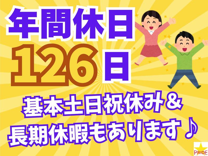休日休暇 | 休日休暇 ★土日祝休み。 →月曜~金曜の平日のみの週5日勤務。 ★完全週休2日制 ★年間休日126日あり →年末年始・GW・お盆など長期休暇もあります♪ |