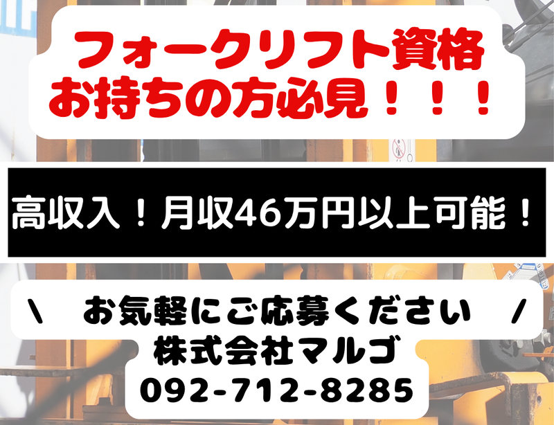 対象となる方 | 求めている人材 学歴不問! フォークリフトの免許必須! カラダを動かすのが好きな方歓迎! ◎高収入のお仕事をお探しの方や ハローワークで求職中の方もぜひ! ★20代・30代活躍中♪ ★転職者も歓迎!飲食店・サービス業・ 現場作業などスタッフの前職は様々! \こんな方にオススメです!/ ○高収入で安定した職に就きたい ○安心して働ける職場を探している ○一生使えるスキルを手に入れたい ○オンオフのメリハリをつけて働きたい ○チームワークを大事にできる ハローワークで求人を探されている方も 是非ご応募ください! ****************** 電話での応募も大歓迎! お気軽にご連絡ください! 【 TEL:092-712-8258 】 ****************** |