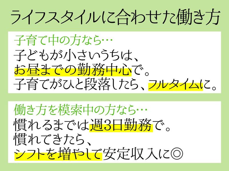 勤務時間 | シフト制 勤務時間詳細 10:00~19:00 ・週3日~OK ・夜勤なし!日勤のみ! ・お昼まで、お昼からの勤務OK ・食事介助の時間をベースに、 シフトを組みます。 朝食介助 7:30 or 8:15~ 昼食介助 12:00 ~ 夕食介助 17:00 or 18:00 ~ ▼シフト例 ・9~14時(朝食介助+昼食介助) ・12~18時(昼食介助+夕食介助) ・13~19時(夕食介助のみ) ※夕食介助に入れる方は、 13時以降の出勤OK! <子育て中のママも活躍中> 短時間勤務OK! 家事との両立ができますよ。 みなさん週3~5日程度で働いています。 |