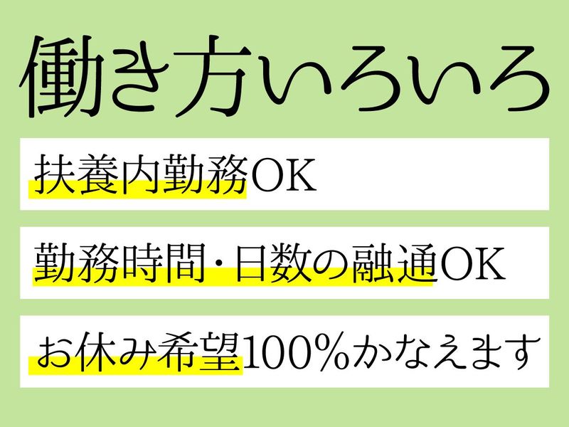 試用期間 | 試用期間あり 試用・研修期間:3ヶ月 試用・研修期間の条件:本採用と同じ 転職直後の収入ダウンを防ぐために 本採用時と同条件でスタート。 各種資格をお持ちの場合は、 時給UPの可能性があります。 お気軽にご相談ください。 |
