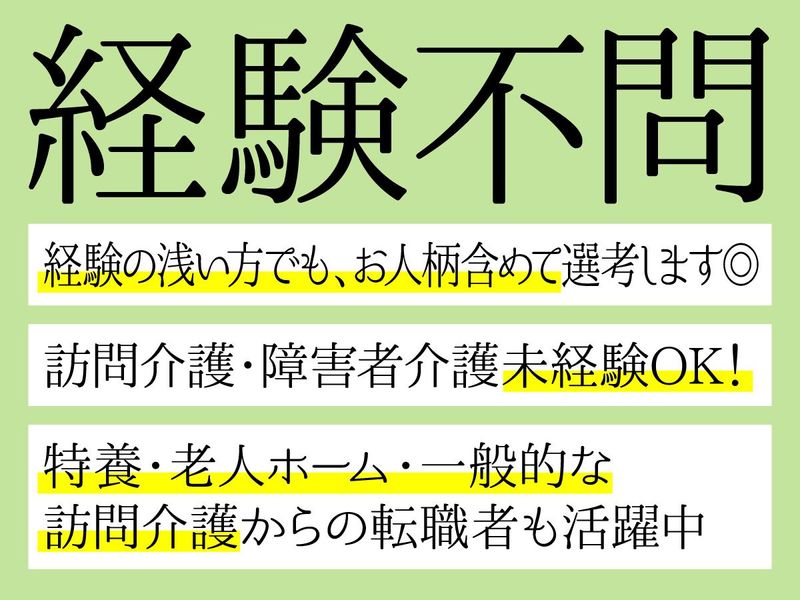 対象となる方 | 求めている人材 訪問介護・障がい者介護の経験は いっさい必要ありません! 利用者様一人一人に、 じっくり向き合いたい方には ピッタリのお仕事です。 ■必須 ・介護福祉士 またはそれ以上の資格をお持ちの方。 ■歓迎する経験・スキル ・何らかの介護経験 ・登録制ヘルパー経験 ・訪問介護経験(優遇可能性あり) ・主婦(夫)さん、フリーターさんも歓迎 ・数年程度のブランクがある方も歓迎 |