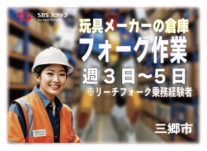 職種/仕事内容 | 仕事内容 フォークリフト作業 今週の新着のご案内 有名玩具メーカー倉庫での、玩具類の入出荷・格納作業をお願いします。 長期・週3日~5日の勤務可能な方を募集します。 基本は、月曜~金曜、繁忙時には土曜日の出勤をお願いする場合があります。 作業は、それほど難しい作業ではありませんが、リーチフォークの乗務経験者を求めています。 商品は、玩具類が主で、重量は1キロ~15キロほどのものとなります。 1日の作業としては、手作業として検品などもお願いしますので、手作業4、フォーク作業6という形になります。 ・休憩室完備/冷蔵庫・電子レンジ・湯沸し器完備 ※お弁当を温めてお食べいただけます。 ・個人ロッカー完備 ・洗面所、男女別完備 ・通勤は、新三郷駅から徒歩10分ほどの場所ですが、バイク通勤もOKです! (マイカー、自転車通勤は不可) ・倉庫内原則禁煙(喫煙スペースあり) その他 ※残業は、月20時間程度をお願いします。 ※有給休暇取得アリ ※事前の休み相談可能 ※雇用保険・社会保険完備 ※交通費実費支給 ※倉庫内スタッフは50人ほどの倉庫です。 ※幅広い年齢の方が活躍されています。 [こんな人が活躍] 黙々と出来る方が活躍中! |