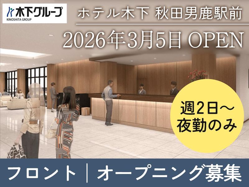 職種/仕事内容 | 仕事内容 ◆◆おすすめポイント◆◆ ✅2026年 3月5日にオープン予定! ✅夜勤のみ&週2日~勤務OK! ✅時給1200円!深夜帯は時給1500円!! ✅ピカピカの館内、最新設備のホテル ✅木下グループの新ホテルで安心スタート ✅フロントデビューしたい方も歓迎! ━━━━━━━━━━━━━━━━━ 【仕事内容】 木下グループの新規事業第1号店! 2026年 3月5日にオープン予定の 「ホテル木下 秋田男鹿駅前」にて 夜勤フロント業務をお任せします。 <具体的には> ■チェックイン/チェックアウト対応 ■お客さまからのお問い合せ対応 ■予約の管理 ■売上の管理 ■メールでのお問い合わせ対応 ■アメニティなど各種在庫管理および発注 ■OTA用プランの作成や SNS/メルマガなどの販促業務 ■清掃・レストランスタッフのサポート 夜間はお客様対応も少なめなので、 データ入力や予約確認などを 自分のペースで進められます。 ※2026年1月〜2月頃より勤務開始予定です。 ━━━━━━━━━━━━━━━━━ 【ホテル木下について】 住宅・不動産・医療・福祉・ スポーツ・エンターテイメントなど 様々な事業を展開する木下グループが 2026年新たにスタートする事業───。 それが、「ホテル木下」です。 その第一号店として、 2026年3月5日にオープンするのが 「ホテル木下 秋田男鹿駅前」。 館内には男女別大浴場やそれぞれ 高温・低温の2種のサウナを完備。 男鹿の自然や海をモチーフにした 客室デザインや、快適に過ごせる 機能的な設備など、木下グループの 長年のノウハウを凝縮したホテルです。 今後も国内において順次、 ホテル事業を展開していく予定です。 ━━━━━━━━━━━━━━━━━ 【地域の魅力を伝える“観光案内役”に!】 多くの観光客が訪れる「男鹿」の玄関口で、 地域の魅力を伝える“観光案内役”として 働くやりがいがあります! オープン前に接客やシステム操作なども 基礎から学べるので、「初めての ホテル業界デビュー」という方も ぜひご応募お待ちしております! みんな一緒にスタートするので、 同期の仲間もできますよ◎ ピカピカの館内、最新設備のホテルで、 立ち上げメンバーとして、お客様を迎える “最初の笑顔”になりませんか? ━━━━━━━━━━━━━━━━━ 【ライフスタイルに合わせて働ける】 夜勤限定の募集で週2日~勤務OK! 昼間に自分の時間を確保したい方や ダブルワーク・副業で安定した収入を 得たい方にもおすすめです◎ 主婦(夫)さん・フリーターさん・ 学生さん・Wワーク希望の方まで 幅広く歓迎いたします。 |