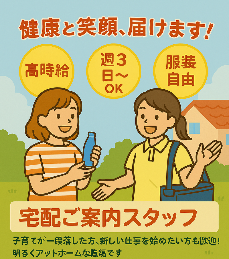 職種/仕事内容 | 仕事内容 子育てがひと段落した方も歓迎! “話すこと”が好きなあなたへ。地域の方とふれあいながら健康を届けるお仕事です。 地域のご家庭を一軒ずつ訪問し、宅配商品のご案内を行います。 まずは無料サンプルを試飲していただくところからスタートし、興味を持ってくださった方には宅配のご案内・クロージングを行います。 \未経験スタートのスタッフも多数在籍/ ✔ 話す内容はトークマニュアル完備 ✔ 初回は先輩と同行研修あり ✔ 一人で不安なときはすぐ相談できる環境です 「話を聞いてくれてありがとう」「頼んでよかった」 そんな言葉がやりがいになるお仕事です! |