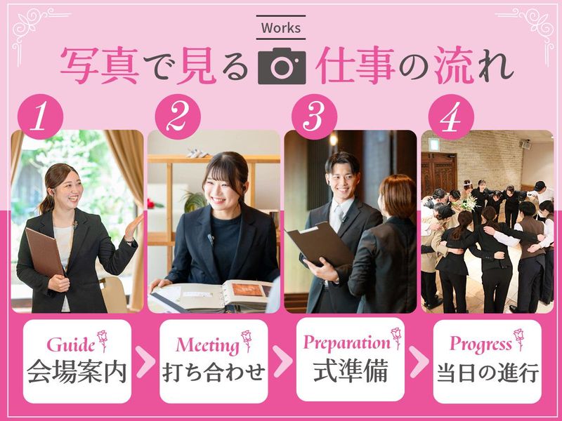職種/仕事内容 | 仕事内容 …――――――――――――――――… 『チームで大きな感動を創る』働き方へ …――――――――――――――――… あなたの思いでチームを動かし一生に一度のイベントを創りませんか? これまでに培ったお客様への対応力はブライダル業界でも大きな強みになるはずです。 未経験の方も、熱い想いがあれば先輩が伴走し、全力でサポートします! - 【仕事内容】 結婚式という一生に一度の舞台をプロデュースする"感動の仕掛け人"へ。 カンタンに《 仕事の流れ 》をご紹介!  ̄ ̄ ̄ ̄ ̄ ̄ ̄ ̄ ̄ ̄ ̄∨ ̄ ̄ ̄ ̄ ̄ ̄ ▼STEP1【 ヒアリング 】 ご見学に来られた新郎新婦様に、どんな結婚式を思い描いているか、二人の馴れ初めなどをヒアリング。 ▼STEP2【 プランニング 】 ヒアリングした内容をもとに「お二人だけの結婚式」のプランをご提案。 ▼STEP3【 打ち合わせ 】 ご契約後、招待状・お花・料理・演出などを一つひとつ形に。平均5〜6回の打ち合わせを重ね、理想の1日を少しずつ創り上げます! ▼STEP4【 結婚式当日 】 最高の1日をチームでプロデュース。音響や照明スタッフ、シェフなど、全てのプロと連携して現場を支えます! ▼STEP5【 アフターフォロー 】 式後も続く、あたたかいお付き合い。結婚記念日にはレストランへご招待し、定期的にご連絡をお取りしています! \\ 未経験でも大丈夫!// 最初は、先輩のアシスタントとして簡単な業務からスタートするのでご安心ください! - 【アトラクティブで働く魅力】 ◇◆「チームで」感動を創り上げる喜び  ̄ ̄ ̄ ̄ ̄ ̄ ̄ ̄ ̄ ̄ ̄ ̄ ̄ ̄ ̄ ̄ ̄ ̄ ̄ ̄ 目標達成の為、一人一人が当事者意識を持ち自分の仕事の役割を超えて助け合える環境です! お客様の最高の笑顔と、結婚式という大きなプロジェクトを、チーム一丸となって成功させる一体感と達成感をぜひ一緒に味わってください! ◇◆「支配人候補」としてキャリアUPも!  ̄ ̄ ̄ ̄ ̄ ̄ ̄ ̄ ̄ ̄ ̄ ̄ ̄ ̄ ̄ ̄ ̄ ̄ ̄ ̄ アトラクティブでは、自身のキャリアデザインも可能。 ウェディングプランナーの経験を積んだ先には、チームを率いるリーダー、 そして「支配人」といったマネジメントポジションも目指せます。 事業の核となる責任ある立場で、より大きな感動を創り出す――。 あなたの意欲と能力次第で、活躍のフィールドは無限に広がります。 将来を見据え、キャリアアップを実現したいと真剣に考えている方にとって最適な環境です。 - 【最新情報】 2026年 春には新しい結婚式場がOPEN予定! 「スターティングメンバーとしての経験を積みたい」という希望も大歓迎なので、遠慮なくご相談ください◎ みんなで一から作り上げる楽しさを体感しながら、新しい結婚式場のオープンを一緒に彩りましょう! |