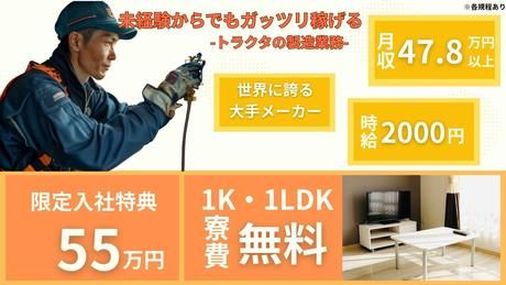 職種/仕事内容 | 仕事内容 ◇◆ 仕事内容 ◇◆ 世界に誇る大手製造メーカーで、トラクタの製造に携わっていただきます。 <組立> インパクトドライバーやトルクレンチなどの工具を使い、部品の取り付けを行います。 基本はライン作業で、流れてくる本体・部材の組立を順序どおりに進めていただきます。 <加工> ギアなどの機械加工を行う機械オペレーター業務です。 といっても難しい操作は少なく、機械へのセットや、完成品の検査・計測が中心です。 <物流> 製造ラインで使用する部品のピッキング、電動カートを使用したラインへの部品供給を担当します。 システム化されているため、複雑な操作はありません。 ―――――――――――――― 部署やラインは多岐にわたりますが、研修の中で「どこが自分に合っているか」を一緒に確認していきます。 入社時に工具に触れたことがない方も多数活躍中! 新しいチャレンジをしてみたい方、大歓迎です。 手厚い補助多数あり♪ 交代勤務でダントツで稼げます!! 手厚い補助・祝金が多数あり! ★現在勤続祝金あり★ 満了金最大55万円 (内訳) 3ヶ月満了: 5万円 6ヶ月満了: 10万円 12ヶ月満了: 15万円 18ヶ月満了: 25万円 ★家賃無料の補助あり★ 遠方からの応募者様には寮費補助! 弊社の家具・家電付き新築寮を完備。 最大家賃6万円まで補助。 年間最大72万円の補助。 ★赴任旅費手当支給★ ご自宅から現地赴任先までの交通費を支給。 (上限5万円) ★紹介キャンペーン実施中★ ご家族・ご友人でお仕事探し中の方いませんか? ご紹介1名につき3万円の紹介料。 ※各種規定あり 採用枠も残り僅かとなりました。 ぜひお問い合わせください! |