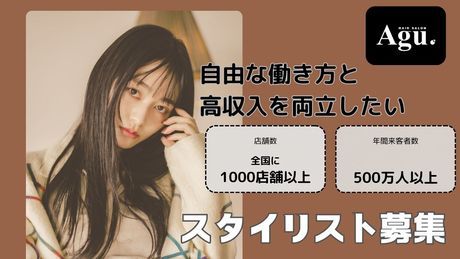 職種/仕事内容 | 仕事内容 【得意を活かして自由に働く!理想のスタイル実現】 カウンセリングから施術、仕上げまでお任せします。 カット・カラー・パーマ・シャンプーなど、あなたの得意を活かして働けます。 業務委託だからこそ、無理なく自分のペースでOK。 「やるときはしっかりやる」「プライベートも大事に」そんな働き方がここで叶います。 【Agu.HAIR SALONの特徴】 人気サロン「Agu.HAIR SALON」はリーズナブルな価格でハイクオリティを提供し、 幅広い世代のお客様に選ばれているグループの代表的なブランドです。 スタッフ同士も仲が良く雰囲気◎全国で1050店舗以上、スタイリスト4300名以上が在籍しています。 東証グロース上場グループなので、将来も見据えて長く働ける美容室です。 「もっと収入を上げたい」「自由に働きたい」そんな想いで正社員やアルバイトから転身した先輩が活躍中 ・新規のお客様は本部がしっかり集客!毎月安定して入客できます ・指名50%、フリー40%、頑張った分だけしっかり収入になります ・個人事業主の美容師のための独自保障制度『スタイリストケア制度』でしっかりサポート! ・独自の確定申告システムを提供。業務委託が初めての方も安心です ・報酬は日払いでスピーディーにGETも可能◎ 【20代~40代活躍中!自分らしく働ける】 20代~40代のスタッフが中心に活躍中! がっつり稼ぎたい人も、子育てと両立したい人も、働き方は本当にそれぞれ。 当社では、技術やトレンドの共有も盛んで、ちょっとした相談もしやすい雰囲気です。 一緒に刺激し合いながら、自分らしく働ける環境が揃っています。 ムリなく続けたい、美容師を楽しみたい。 そんな方にぴったりの職場です。 【代表より一言】 美容師という仕事は、技術だけじゃなく「人」そのものに価値がある仕事です。 働き方が多様化する今、もっと自由に、もっとあなたらしく活躍できる環境をつくりたい。そんな想いでサロンを立ち上げました。 「ムリせず長く続けたい」「もっと稼ぎたい」「家庭と両立したい」どんな想いも大歓迎! スタイリスト一人ひとりが、心からこの仕事を楽しめるよう、私たちが全力でサポートします。 |